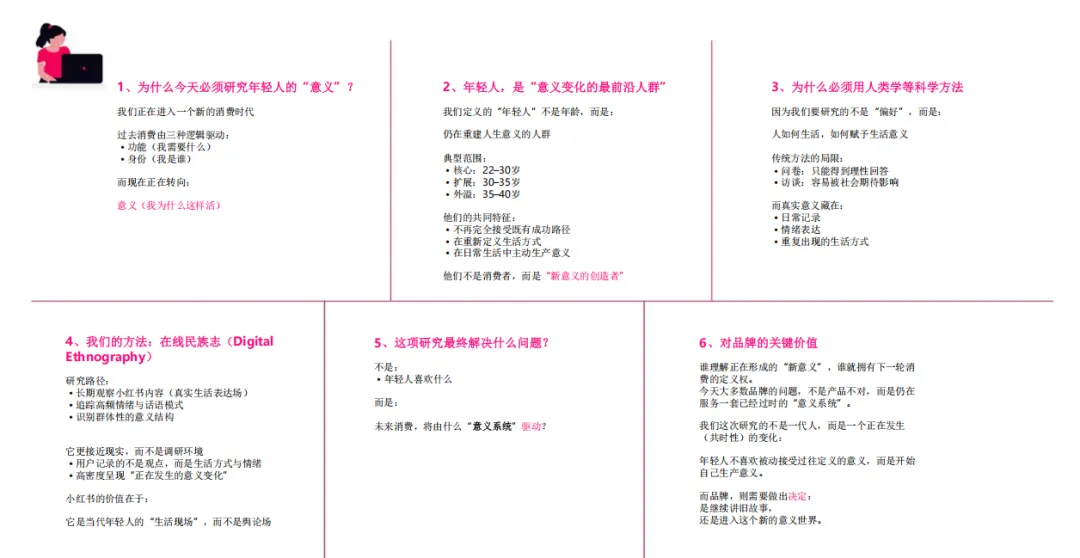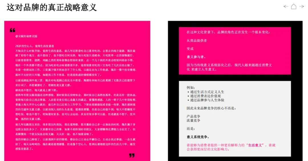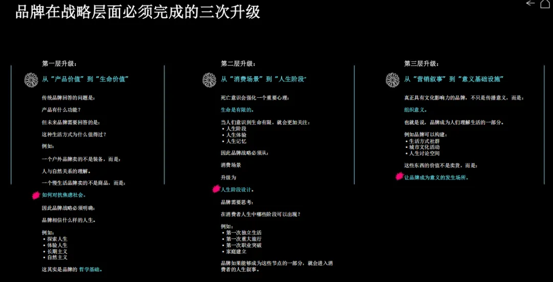 对品牌而言,必须完成三次战略升级:从产品价值升级为生命价值,回答 “这种生活为何值得过”;从消费场景升级为人生阶段,成为独立、成长、陪伴的节点;从营销叙事升级为意义基础设施,搭建社群、空间、内容,让用户在此生产意义。未来品牌不再是卖货,而是提供一套自洽的生活哲学,成为年轻人意义世界的共建者。