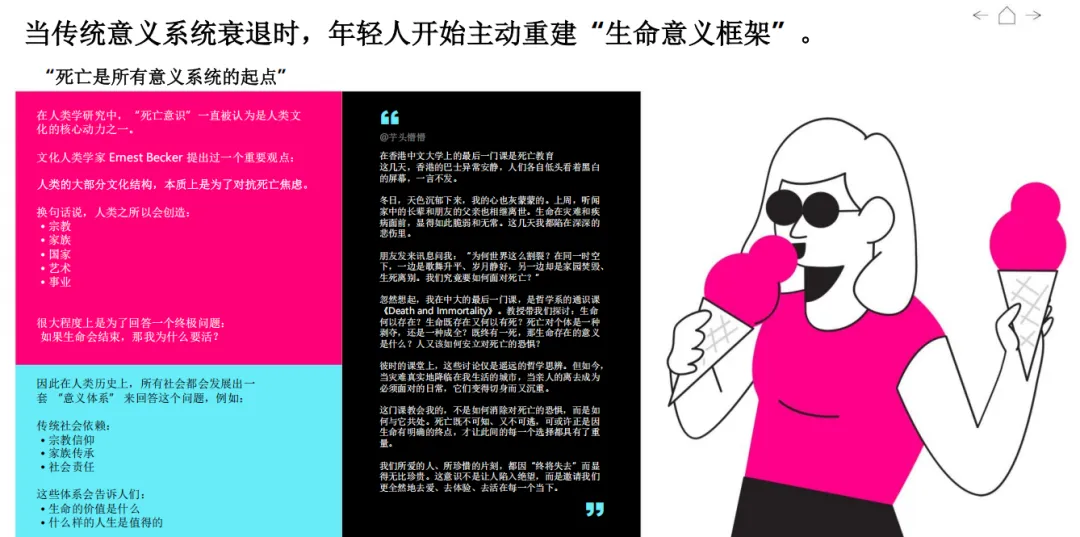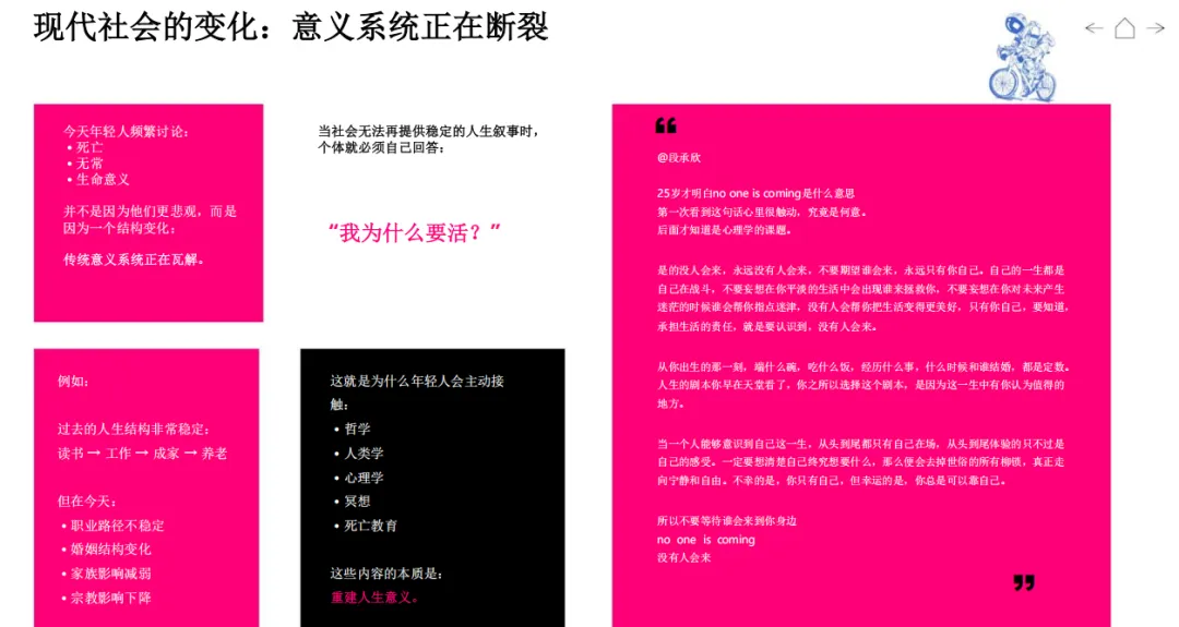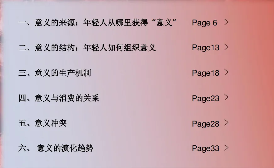 报告核心判断:年轻人不再追求外部赋予的成功,而是向内寻找 “我为何而活”。传统意义系统(读书 — 工作 — 成家 — 养老)瓦解,死亡焦虑、无常意识、空心感普遍存在,促使他们转向哲学、心理学、冥想、自然疗愈,重建内在坐标。消费不再是满足功能,而是构建自我、表达边界、安放情绪的实践,品牌竞争从此进入意义系统竞争。