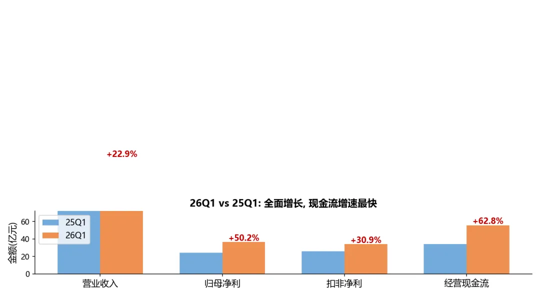 先看最直观的数据。一季度营收132.37亿, 同比+22.9%; 归母净利36.61亿, 同比+50.2%; 经营现金流55.63亿, 同比+62.8%。