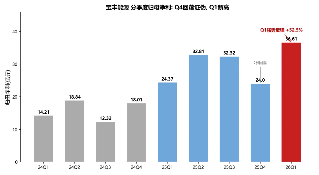 结果呢? 26Q1直接干到36.61亿, 不光环比Q4暴增52.5%, 还创了单季度历史新高。Q4那个24亿大概率就是个季节性低点, 烯烃行业本来就是Q2Q3旺季、Q1Q4淡季, 去年Q4叠加了新产能集中释放压价, 属于双重扰动。一个季度就回来了, 说明宝丰的盈利底盘是扎实的。