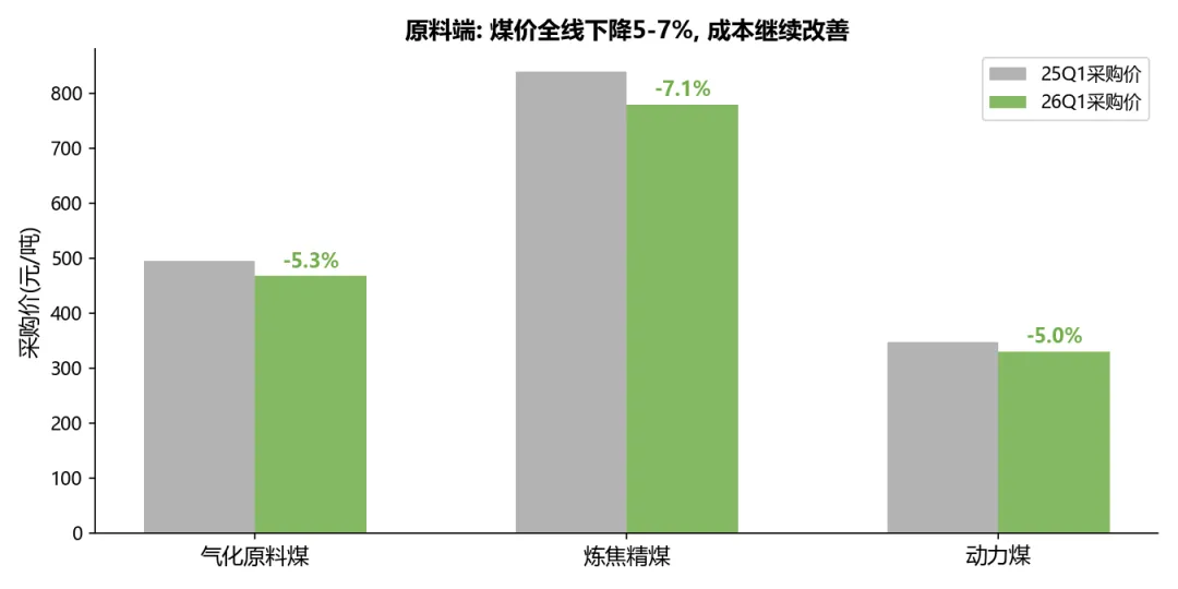 宝丰不一样。它的成本端是煤, 而且还在降: 气化原料煤采购价468元/吨, 同比降了5.3%; 炼焦精煤779元/吨, 降了7.1%。