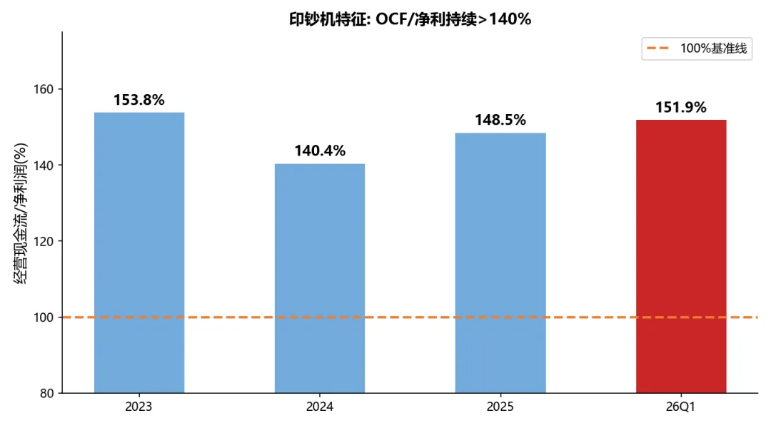 Q1经营现金流55.63亿, 净利润36.61亿, 比值151.9%。啥意思呢? 账面赚1块钱, 实际到手1.5块。这个数字从2023年开始就没低于过140%——2023年153.8%, 2024年140.4%, 2025年148.5%, 26Q1继续151.9%。