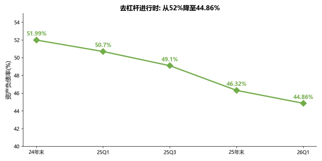 资产负债率从2024年末的52%一路降到了26Q1的44.86%, 一年半降了7个百分点。短期借款为零, 长期借款利率从之前的5%降到了2.34%-3.75%。账上货币资金49.49亿, 虽然覆盖不了全部有息负债, 但一个季度经营造血55亿, 年化220亿+, 偿债能力完全不用担心。