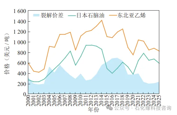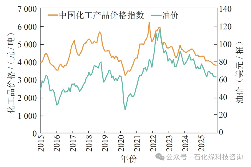 近年来,国内大宗化学品价格与国际原油价格的相关性显著减弱,传统的“油价主导”定价模式正在发生深刻转变。特别是2022年以来,受俄乌冲突等地缘政治风险等因素影响,国际油价一度突破100美元/桶,带动全球大宗商品价格快速上涨。然而,国内石化产业链的盈利水平并未同步改善,反而因成本大幅攀升而承受巨大压力,行业利润整体下行甚至出现亏损。两者的相关系数跌至0.1左右,远低于0.6~0.9的历史平均水平。造成这种“脱钩”现象的核心原因在于供需结构的失衡。从供应端看,高油价直接推高了石脑油等基础原料价格,使以石脑油为路线的乙烯等装置生产成本大幅攀升。但从需求端看,受疫情等因素制约,国内消费增长动力不足,同时大量新增产能集中投放,使得消费增速远低于供给增速,“高成本、弱需求、强供给”格局导致产业链成本传导机制受阻。下游行业对高价原料的接受度有限,石化产品价格上涨乏力,石脑油—乙烯裂解价差长期徘徊在200美元/吨低位,甚至出现倒挂,众多一体化及下游化工企业陷入阶段性持续亏损。此现象表明,国内石化产品定价机制已由“成本推动”主导,逐步转变为由“成本支撑”、“供需基本面”与“国内产能结构”多重因素共同主导的复杂博弈格局。2015—2025年布伦特油价走势见图1,2000—2025年石脑油和乙烯价格走势见图2。