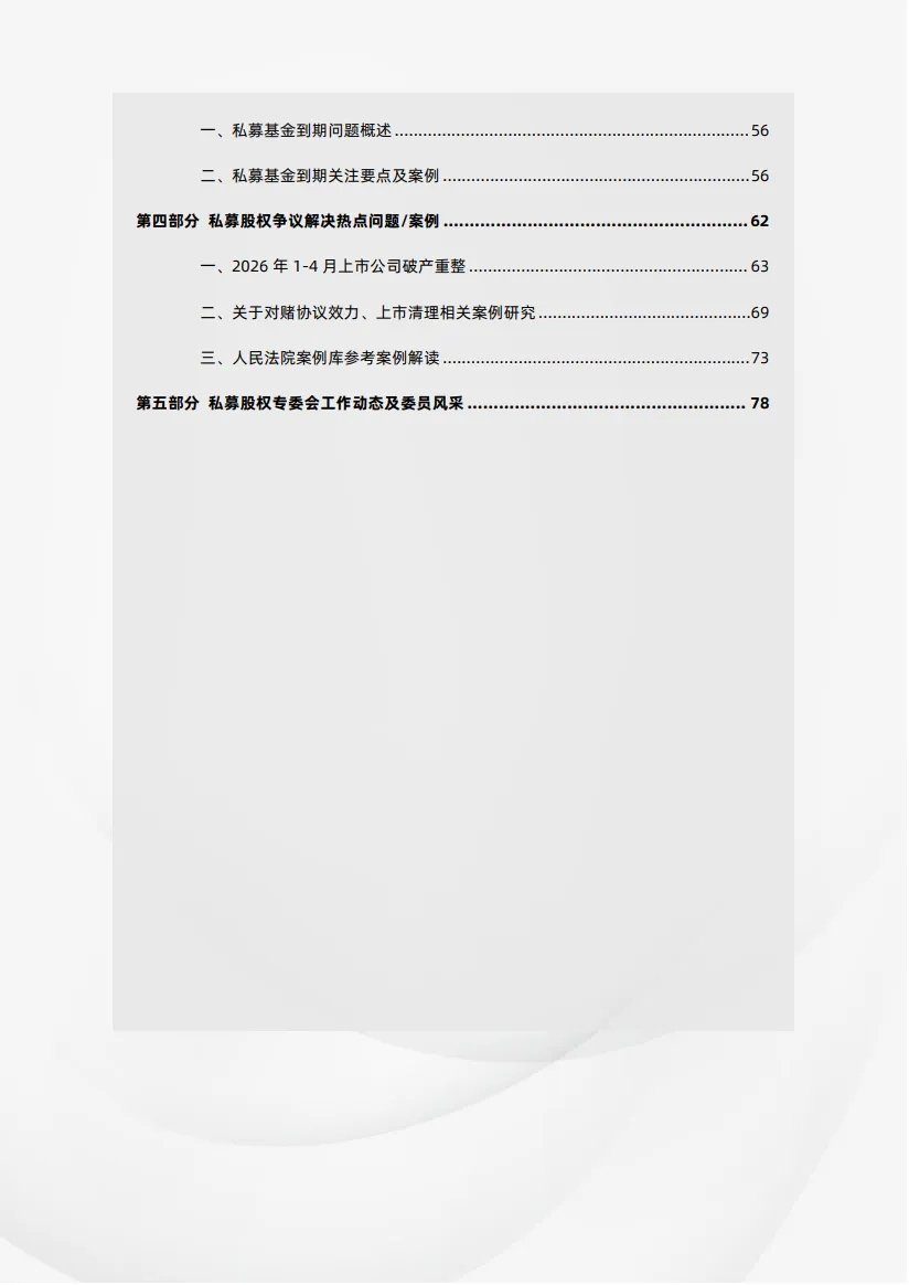 ·争议解决热点:梳理2026年上市公司破产重整中“产业+基金”参与模式;通过典型案例明确对赌协议效力判断标准(区分“对赌复活”与“债权展期”),并强调私募保底协议因违反公序良俗应属无效。