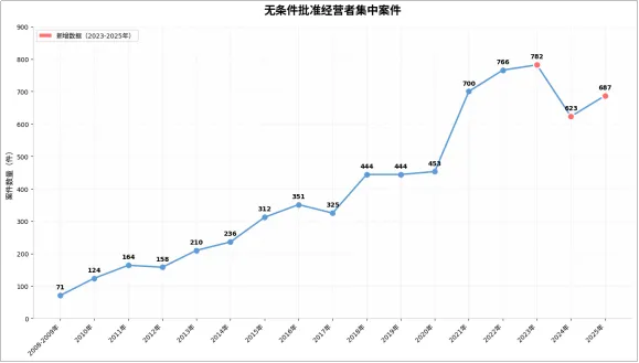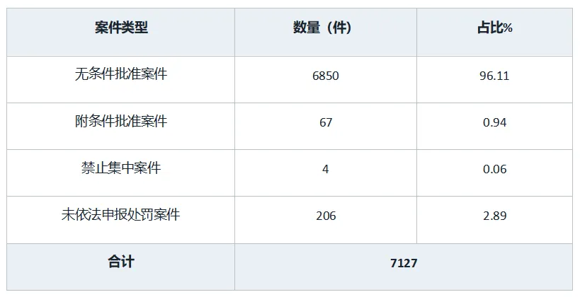 • 无条件批准案件统计范围为2014年至2025年市场监管总局公示的案件,此前年份数据未完全公开;