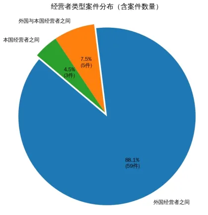 从经营者主体类型分布来看,附条件批准案件中集中主体占比最大的是外国经营者之间,占比 88.1%,共 59 件;其次是外国与本国经营者之间,占比 7.5%,共 5 件;最小的部分是本国经营者之间,占比 4.5%,共 3 件。