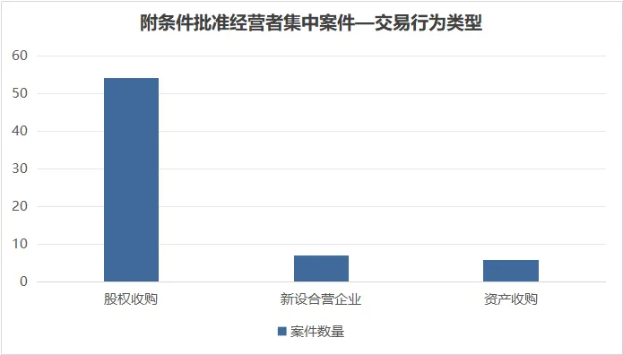 从交易行为类型来看,附条件批准案件主要涉及股权收购(54件,占比80.6%)、资产收购(6件,占比9.0%)、新设合营企业(7件,占比10.4%)等多种类型。其中,股权收购是最常见的集中类型,占比超过八成。