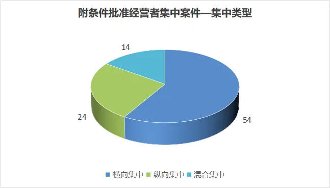 横向集中是附条件批准的主要集中类型(54件,占比80.6%)。这与反垄断理论一致,即横向合并直接消除竞争对手,最易产生单边效应或协调效应,因而更可能被附加限制性条件。