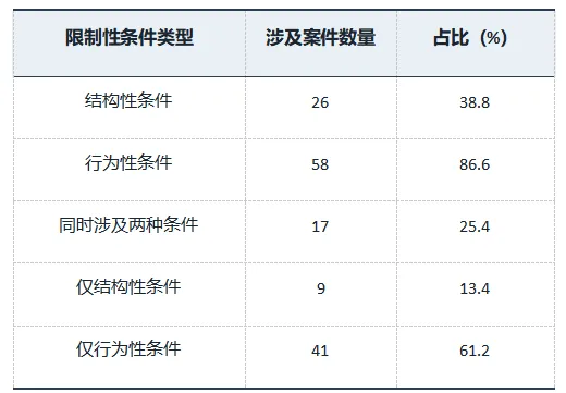 在67件附条件批准经营者集中案件中,共有58件案件涉及行为性条件,26件案件涉及结构性条件。其中,两者兼具的有17件,仅涉行为性条件的有41件,仅涉结构性条件的有9件。