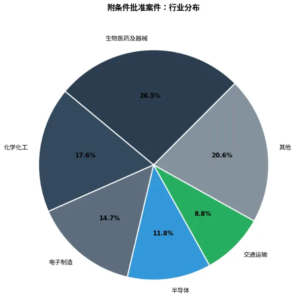 67件附条件批准案件涉及多个行业领域,其中生物医药、化学化工、电子制造、半导体、交通运输、汽车等行业的案件较为集中。这些案件通常涉及市场份额较高、竞争影响较大的交易。