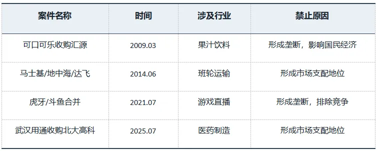 1. 时间分布特点:4起禁止案件分布在2009年、2014年、2021年、2025年,时间间隔逐渐缩短,体现了反垄断执法力度的不断加强。