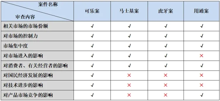 从审查内容的要点进行分析,我国执法机构对四起禁止经营者集中案件审查内容的情况存在一定出入,但均考虑了相关市场的市场份额、对市场的控制力、相关市场的市场集中度、对消费者和其他有关经营者的影响等因素。