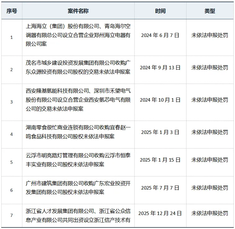 以下为2023-2025年新增的7件未依法申报经营者集中处罚案件列表: