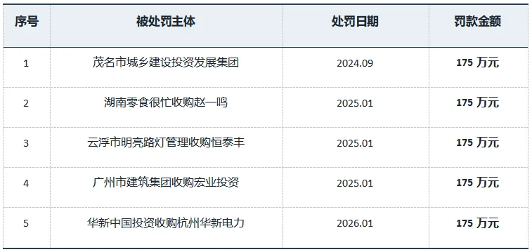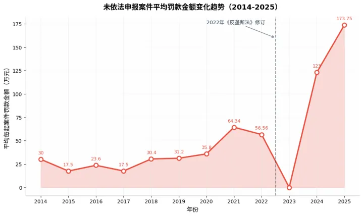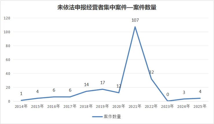 纵观2023-2025全年,未依法申报而被处罚的案件平均每年新增6起,处罚力度大幅回落。2021年以来,查处案件数量显著增加,执法威慑效应逐步显现。