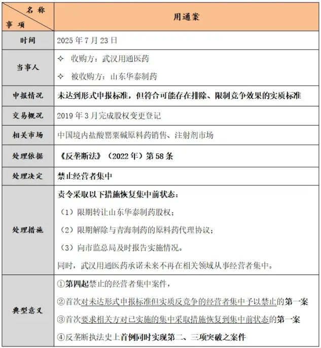 2025年7月22日,市场监管总局发布公告,禁止武汉用通医药有限公司(以下简称“武汉用通”)收购山东北大高科华泰制药有限公司(以下简称“华泰制药”)股权案。