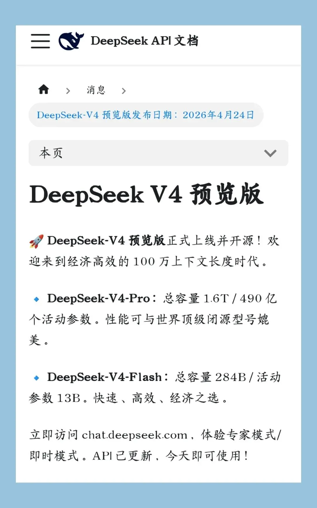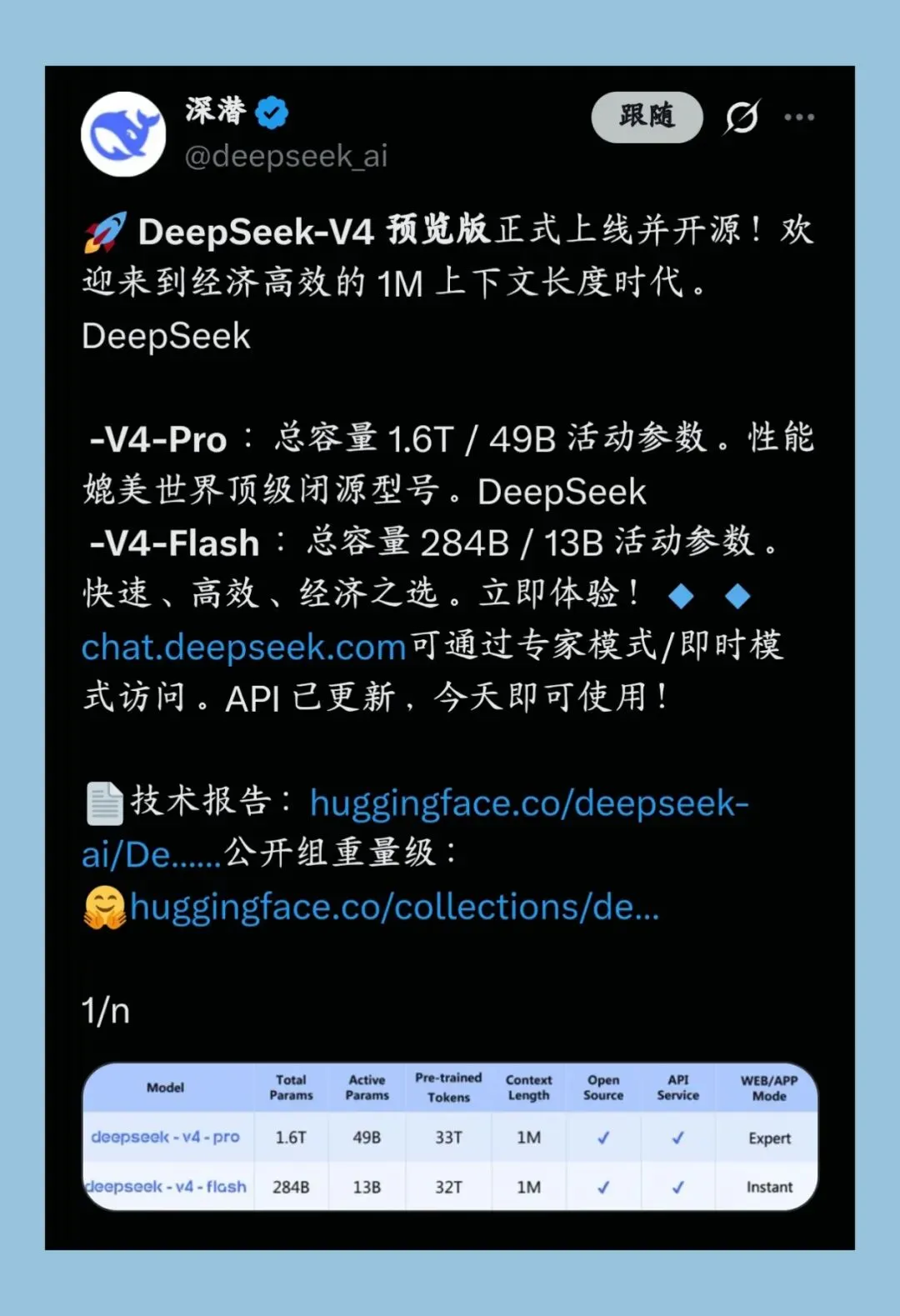 今天(4月24日)想必大家也在各大平台上刷到了,DeepSeek V4 旗舰大模型的发布。“1.6T参数”、“适配华为昇腾芯片”、“API价格击穿底线”。