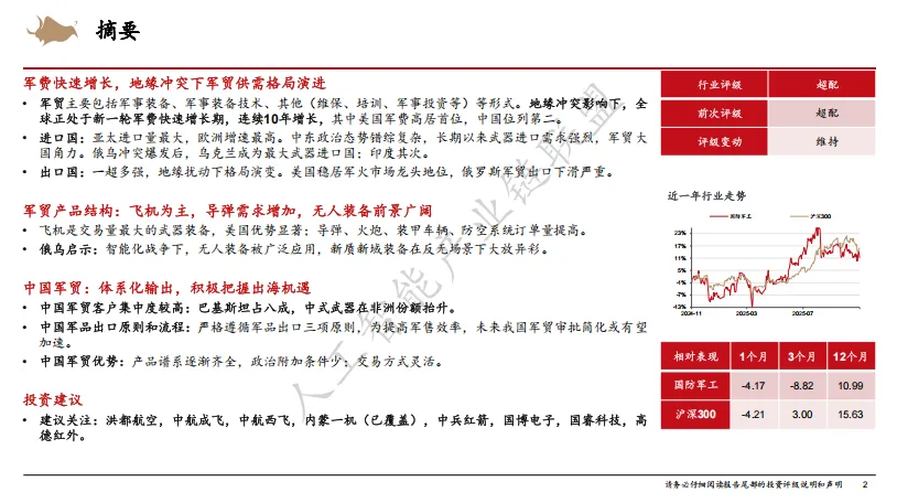 全球军费上行周期明确,军贸格局持续重塑。中国装备凭借性价比、体系化、无政治附加条件三大核心优势,正迎来军贸出海的历史性机遇。航空、陆装、弹药、无人装备等细分领域有望持续受益,中国军工产业的全球话语权正在快速提升。