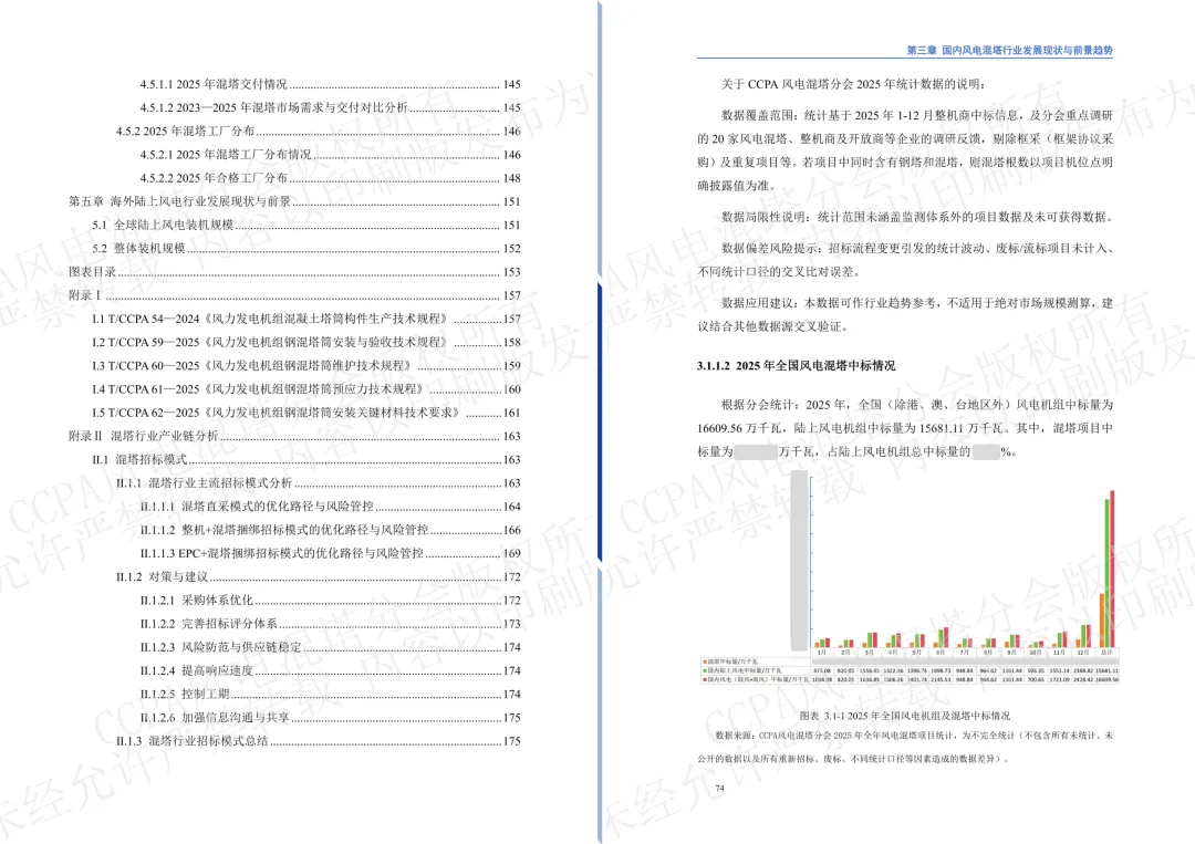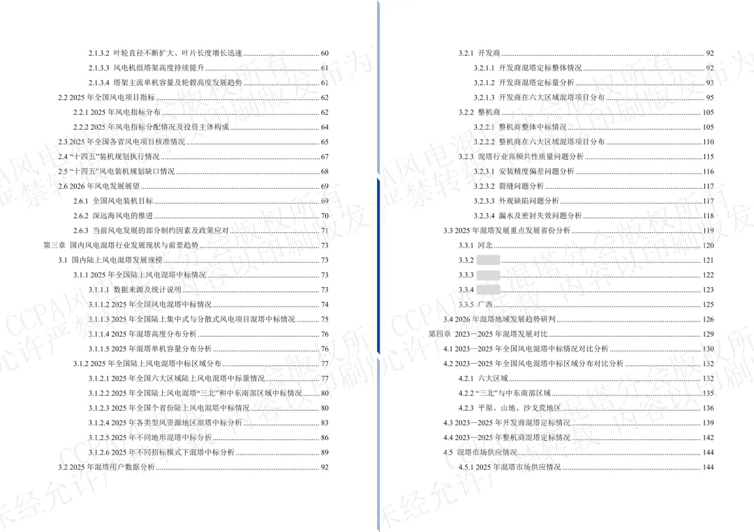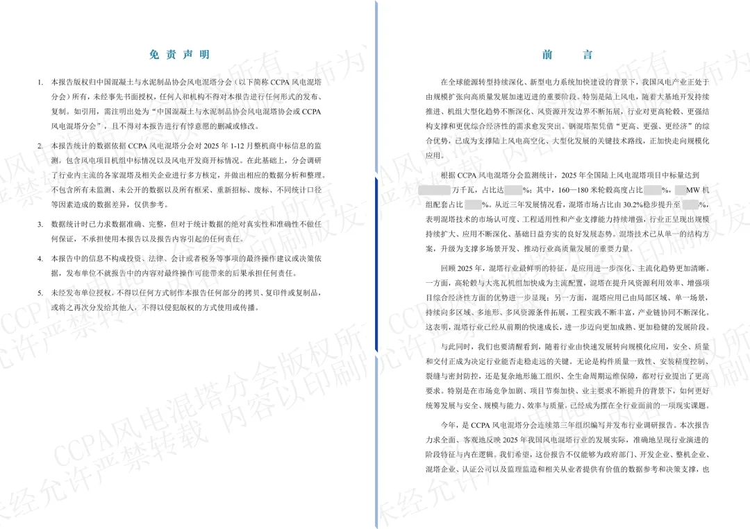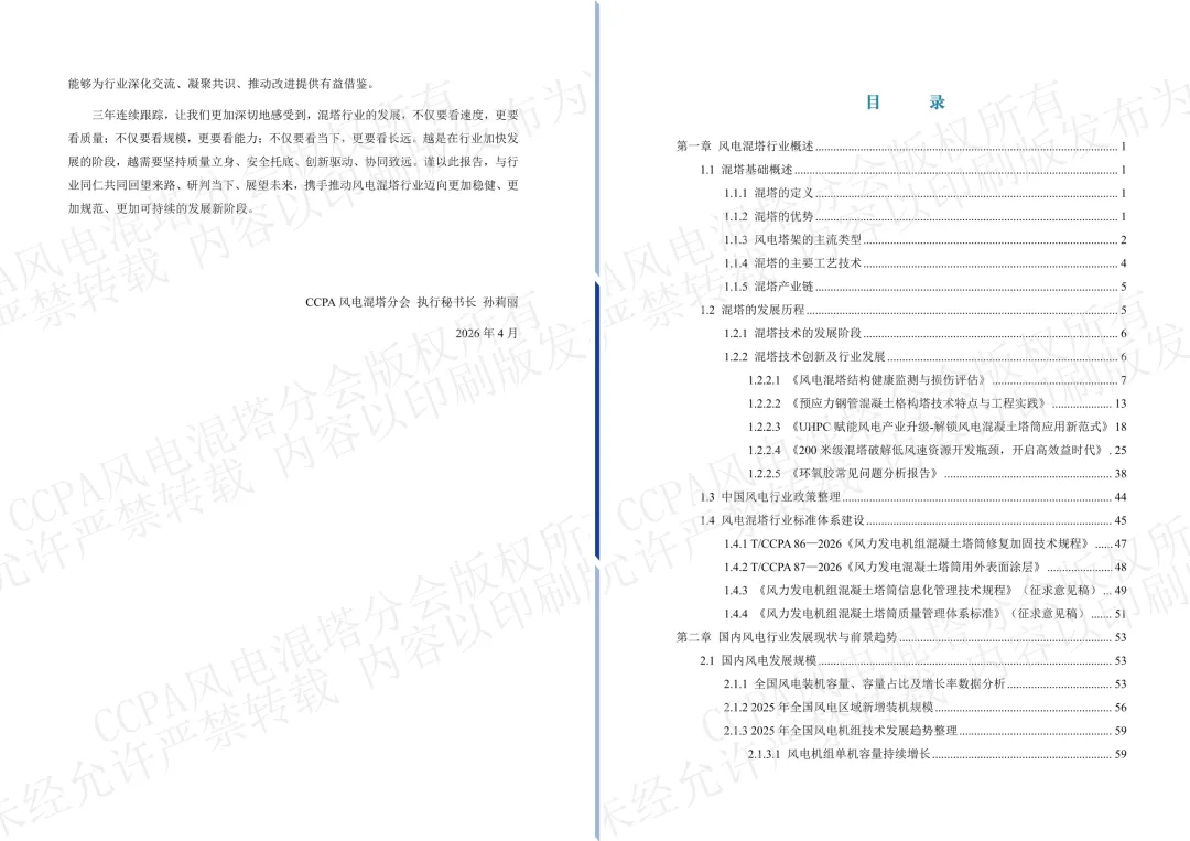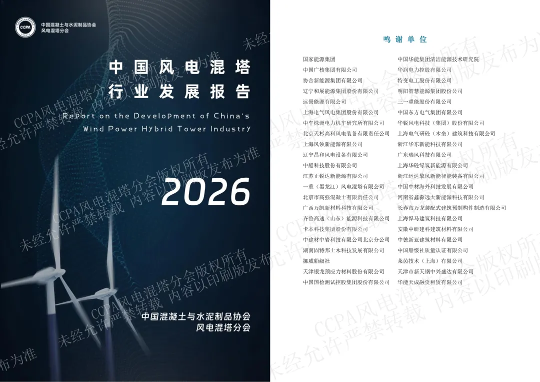 在全球能源转型持续深化、新型电力系统加快建设的背景下,我国风电产业正处于由规模扩张向高质量发展加速迈进的重要阶段。特别是陆上风电,随着大基地开发持续推进、机组大型化趋势不断深化、风资源开发边界不断拓展,行业对更高轮毂、更强结构支撑和更优综合经济性的需求愈发突出。钢混塔架凭借“更高、更强、更经济”的综合优势,已成为支撑陆上风电高空化、大型化发展的关键技术路线,正加快走向规模化应用。回顾2025年,混塔行业最鲜明的特征,是应用进一步深化、主流化趋势更加清晰。今年,是CCPA风电混塔分会连续第三年组织编写并发布行业调研报告。本次报告力求全面、客观地反映2025年我国风电混塔行业的发展实际,准确地呈现行业演进的阶段特征与内在逻辑。我们希望,这份报告不仅能够为政府部门、开发企业、整机企业、混塔企业、认证公司以及监理监造和相关从业者提供有价值的数据参考和决策支撑,也能够为行业深化交流、凝聚共识、推动改进提供有益借鉴。“越是在行业加快发展的阶段,越需要坚持质量立身、安全托底、创新驱动、协同致远。”谨以此报告,与行业同仁共同回望来路、研判当下、展望未来,携手推动风电混塔行业迈向更加稳健、更加规范、更加可持续的发展新阶段。 CCPA风电混塔分会 执行秘书长 孙莉丽