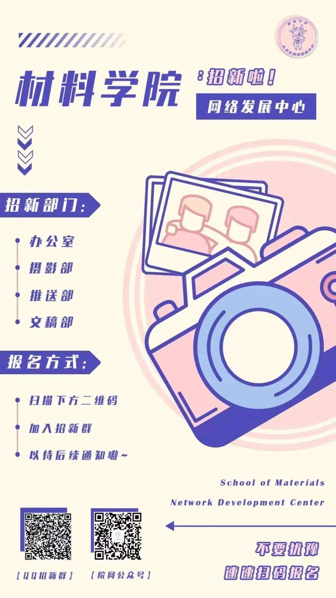 加入我们请联系QQ:1653590842,材料学院大学生网络发展中心随时欢迎大家的加入(不限年级)!