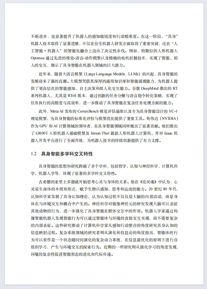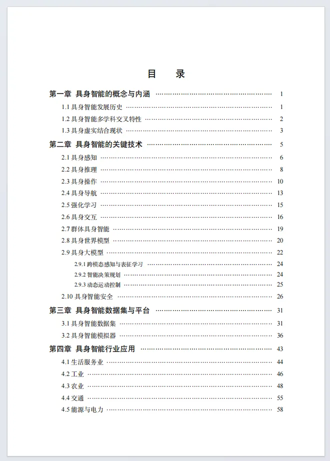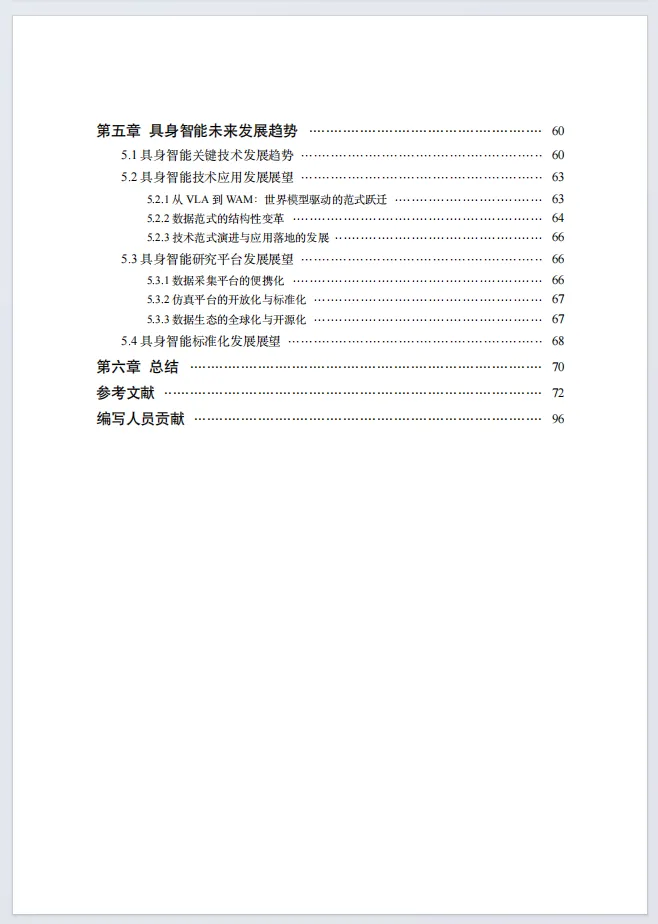 覆盖生活服务、工业、农业、交通、能源电力五大应用场景,呈现规模化落地进展。展望关键技术、应用落地、研究平台、标准化四大发展方向,强调安全可信与伦理治理,提出构建全栈标准体系,推动具身智能从实验室走向产业规模化应用。