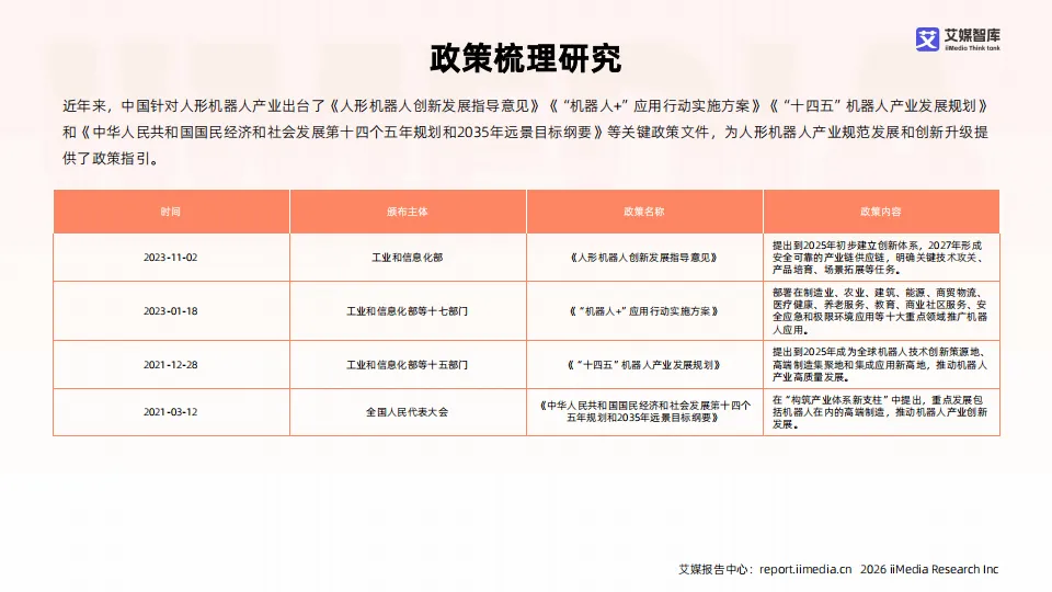 2025年中国人形机器人产业处于技术加速突破与商业化探索并行的阶段,作为技术高度集成的前沿领域,产业依托人工智能、精密传感、仿生结构等技术协同发展,呈现政策与资本双驱动、头部企业引领的格局。产业划分为工业协作、专业服务、家庭陪伴、科研特种四大类型,应用场景持续拓展,但整体仍未进入规模化落地期,以示范应用与技术验证为主。