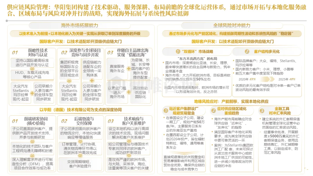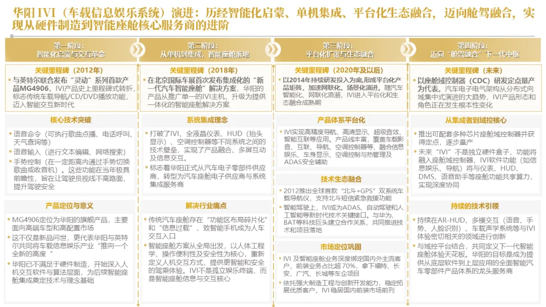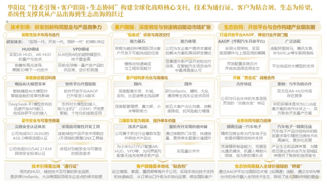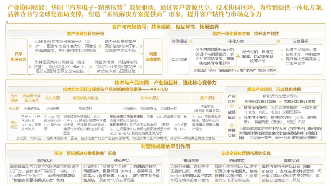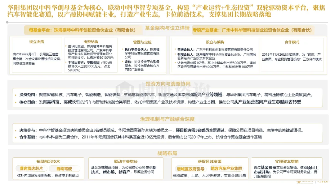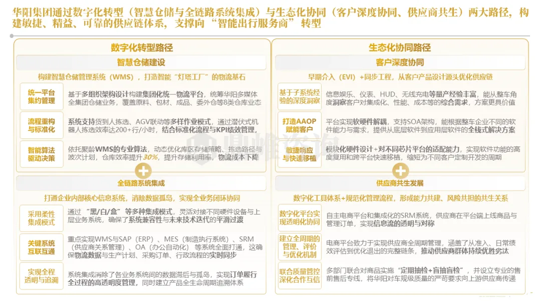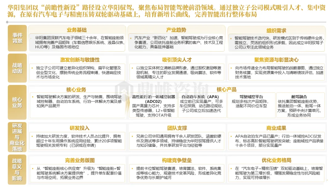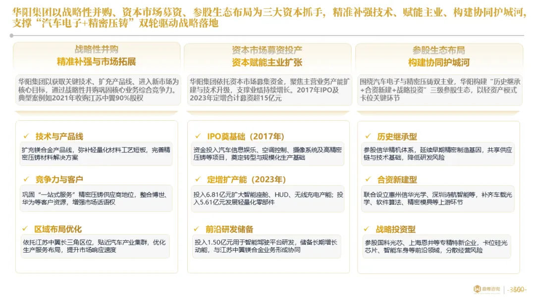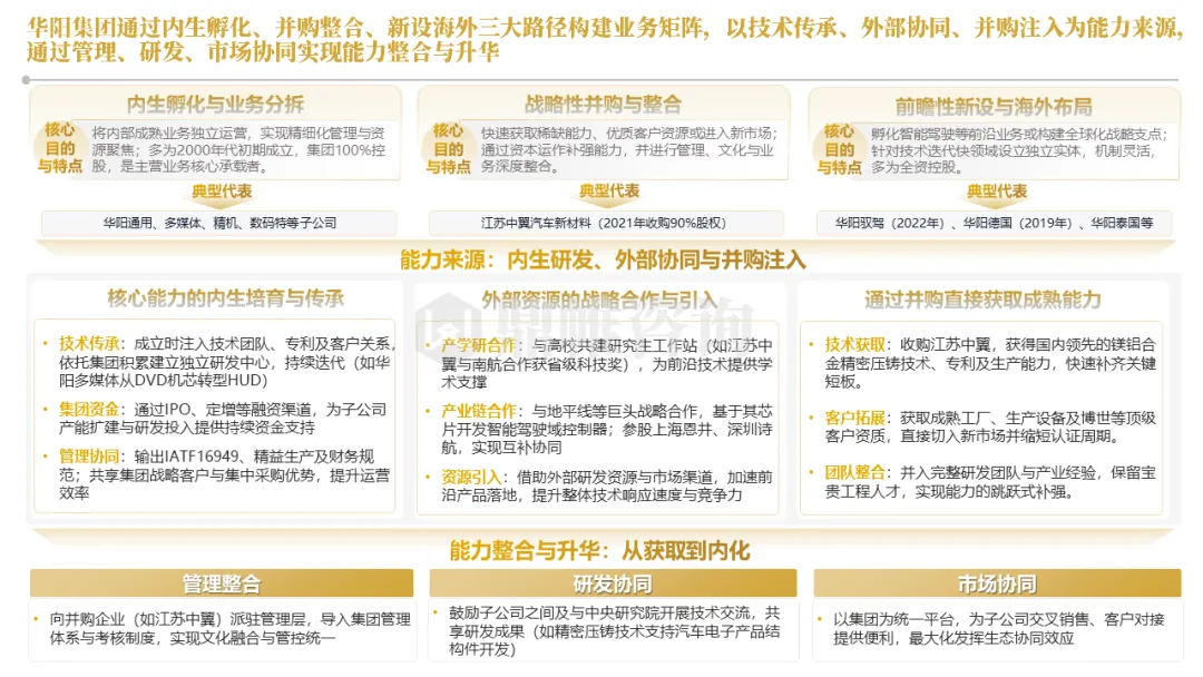 针对明确的能力短板,华阳发起精准的战略并购(如收购江苏中翼),快速获取核心技术与高端客户资源。同时,通过参股、合资等方式前瞻性布局智能驾驶等前沿领域,以轻资产模式卡位未来产业链关键环节,构建生态协同