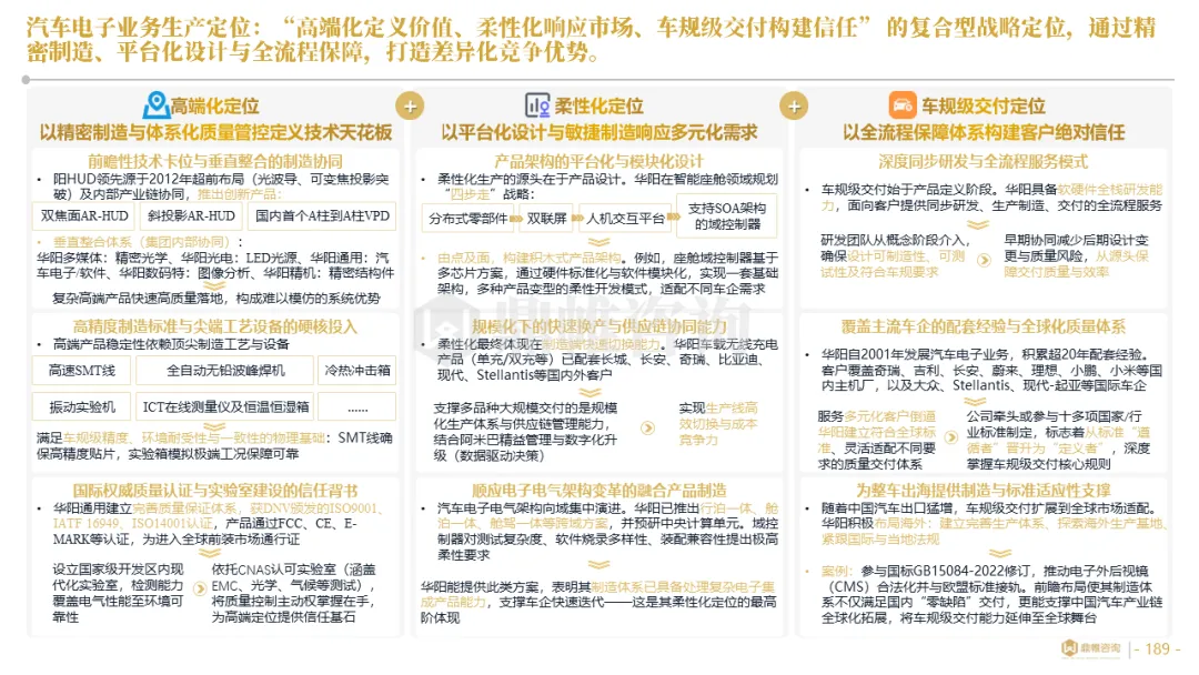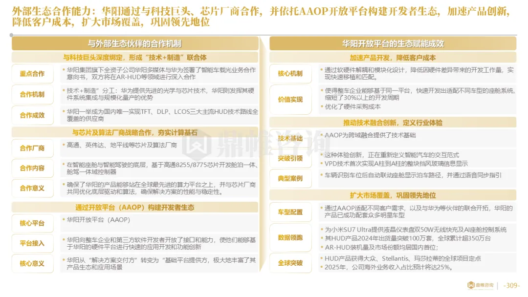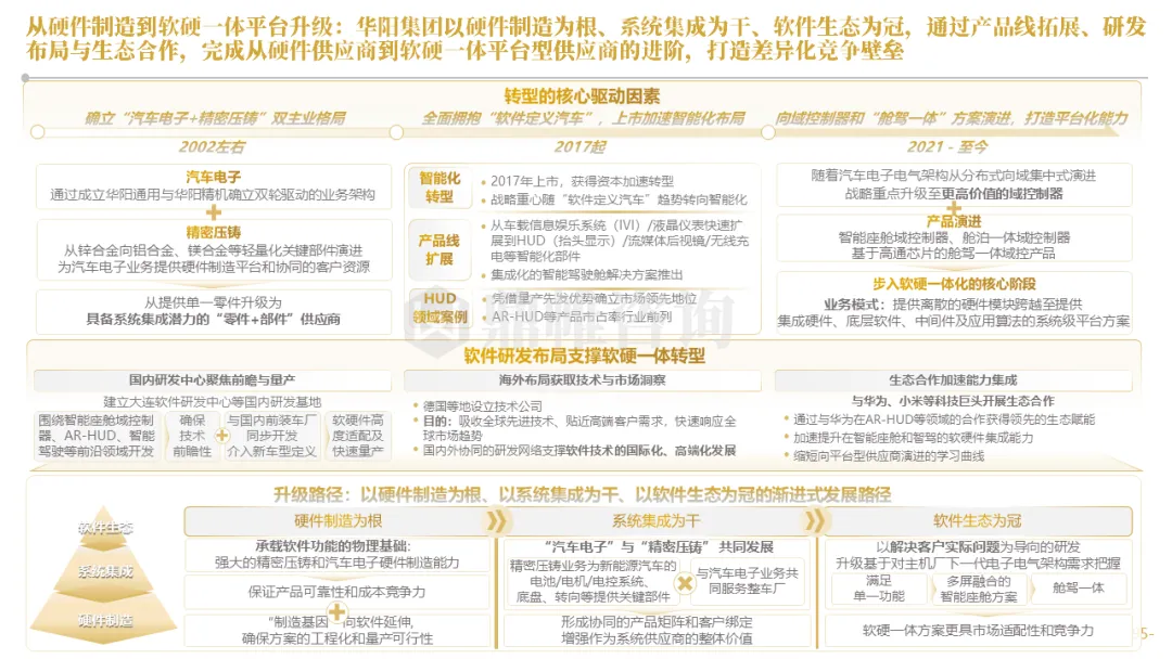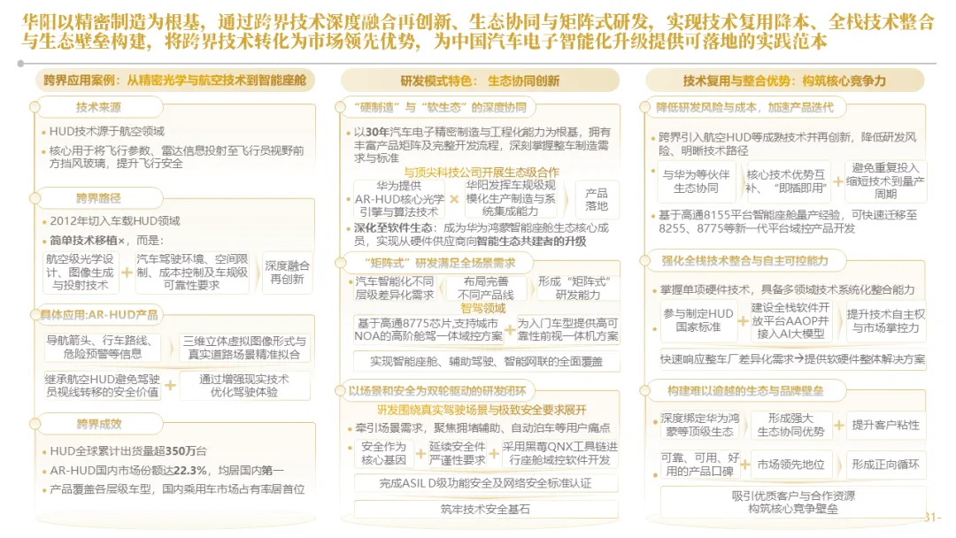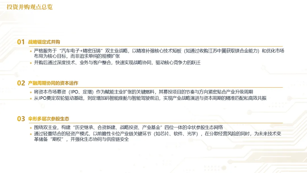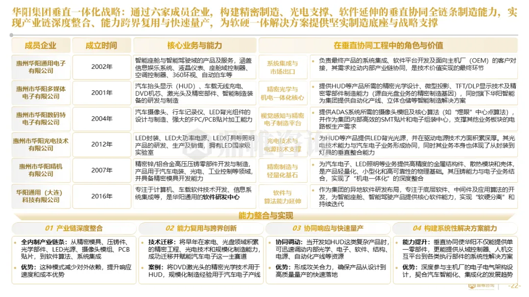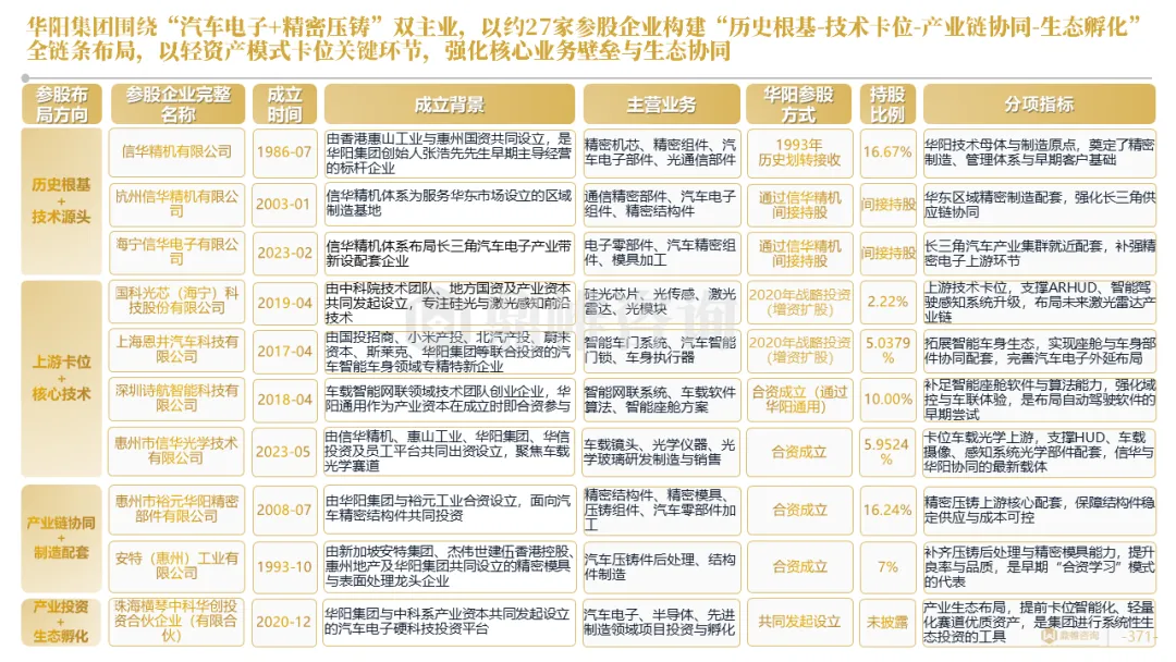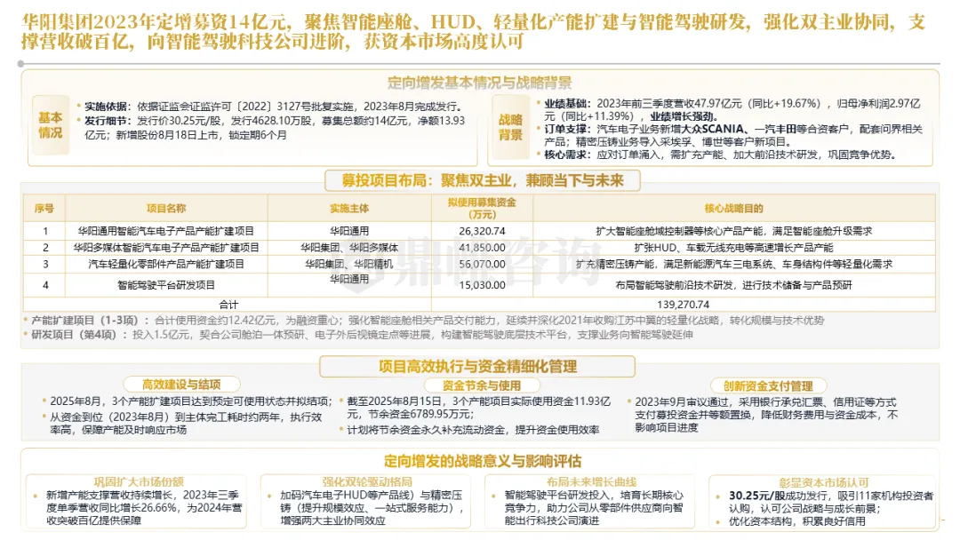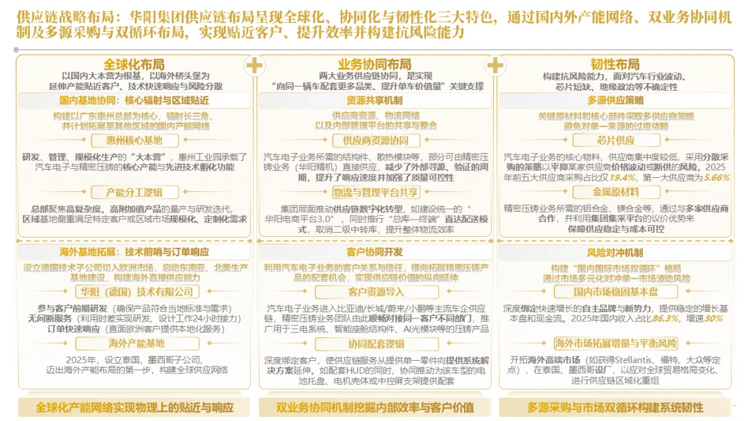 针对明确的能力短板,华阳发起精准的战略并购(如收购江苏中翼),快速获取核心技术与高端客户资源。同时,通过参股、合资等方式前瞻性布局智能驾驶等前沿领域,以轻资产模式卡位未来产业链关键环节,构建生态协同