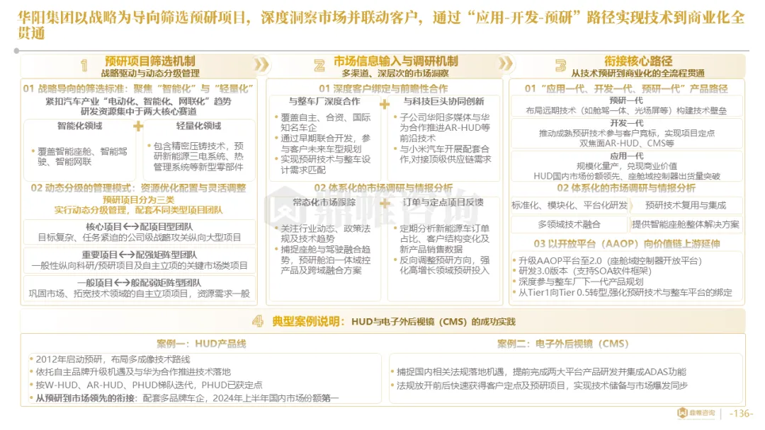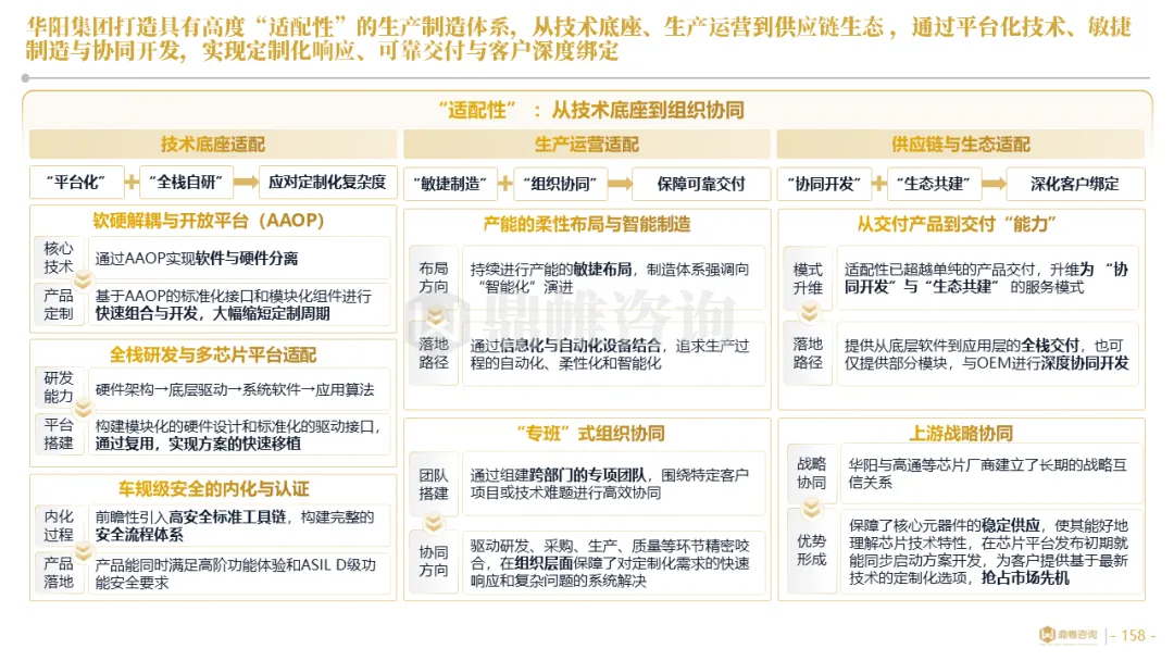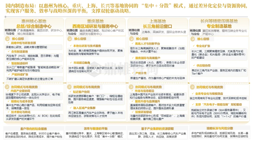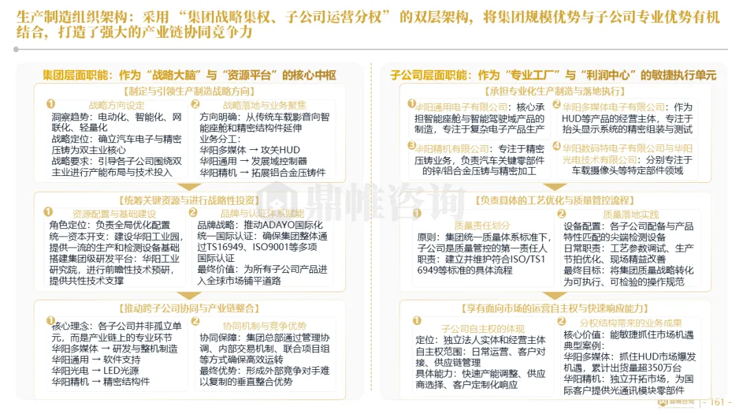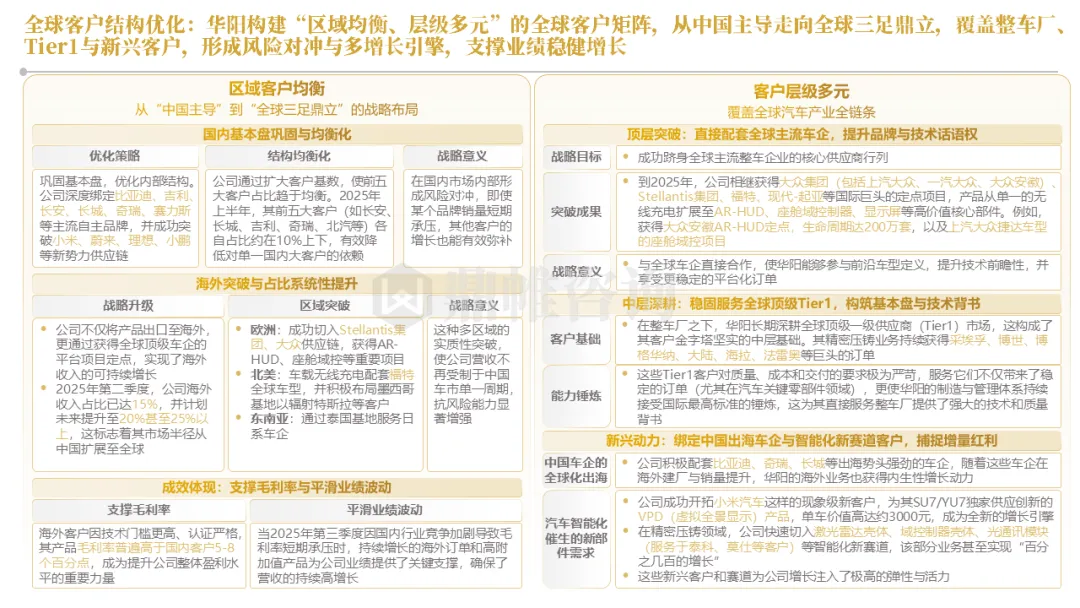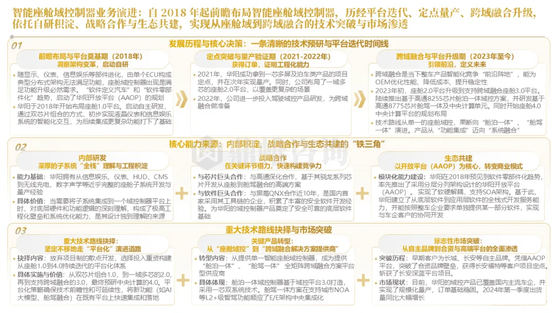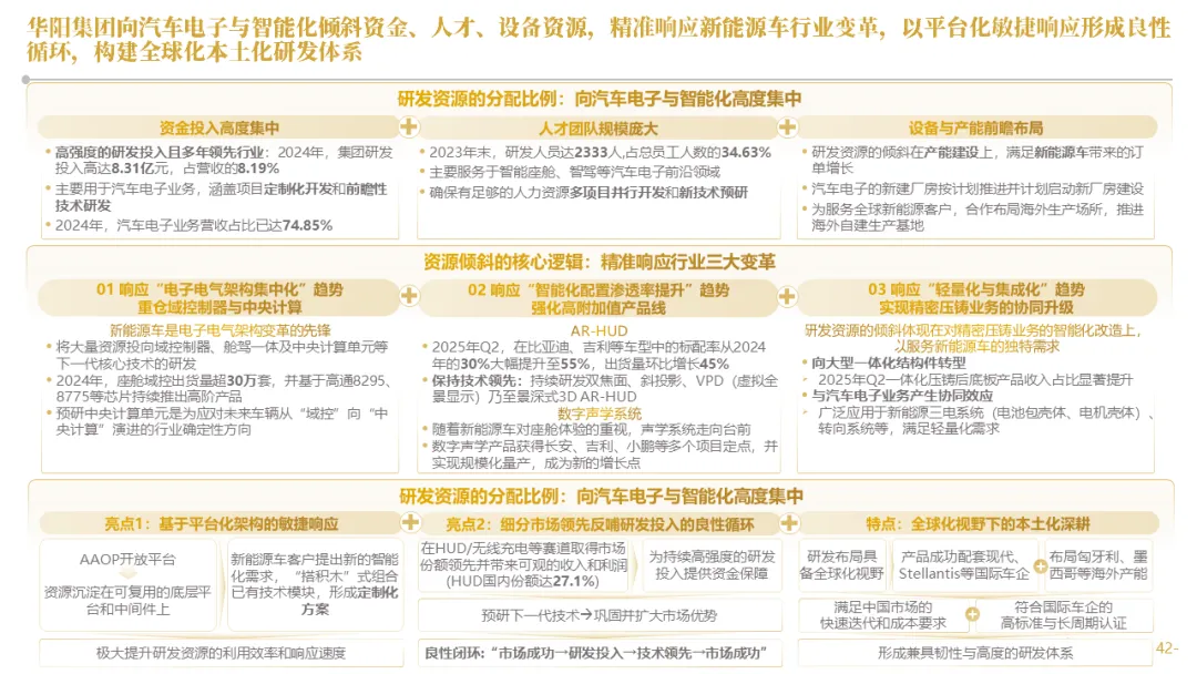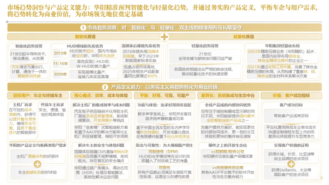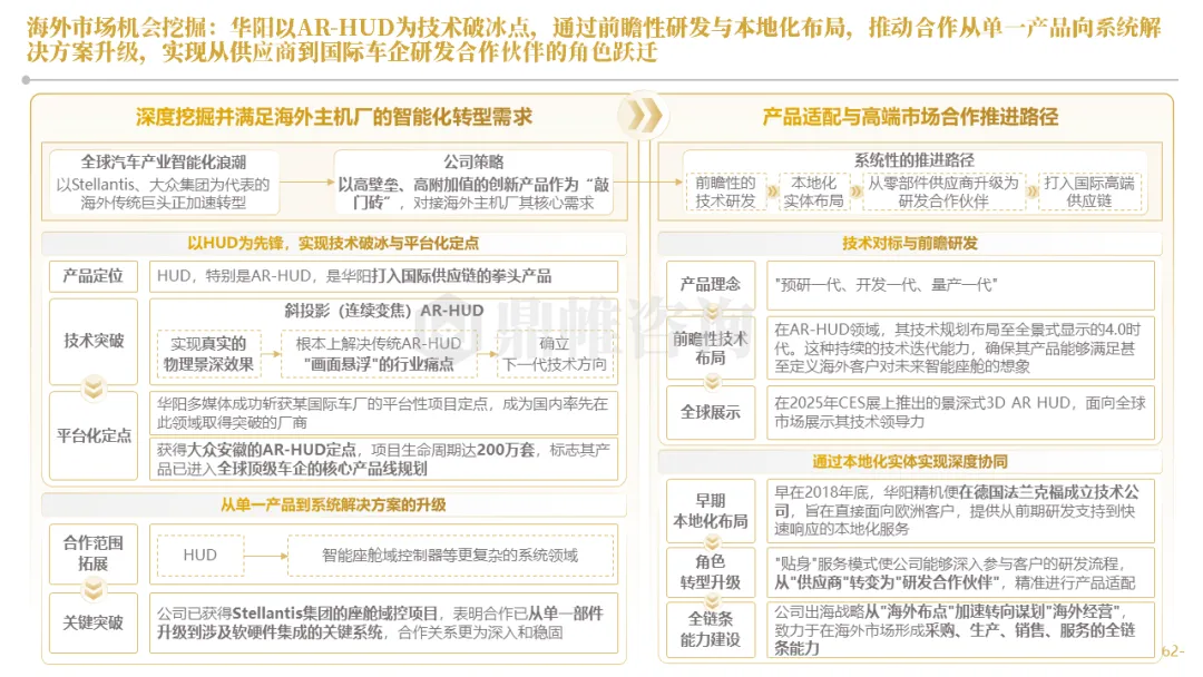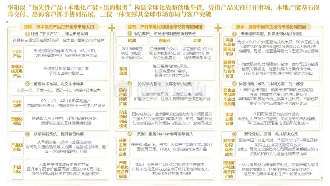 针对明确的能力短板,华阳发起精准的战略并购(如收购江苏中翼),快速获取核心技术与高端客户资源。同时,通过参股、合资等方式前瞻性布局智能驾驶等前沿领域,以轻资产模式卡位未来产业链关键环节,构建生态协同