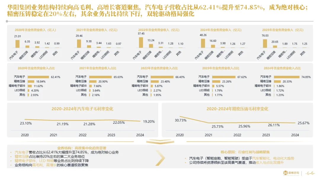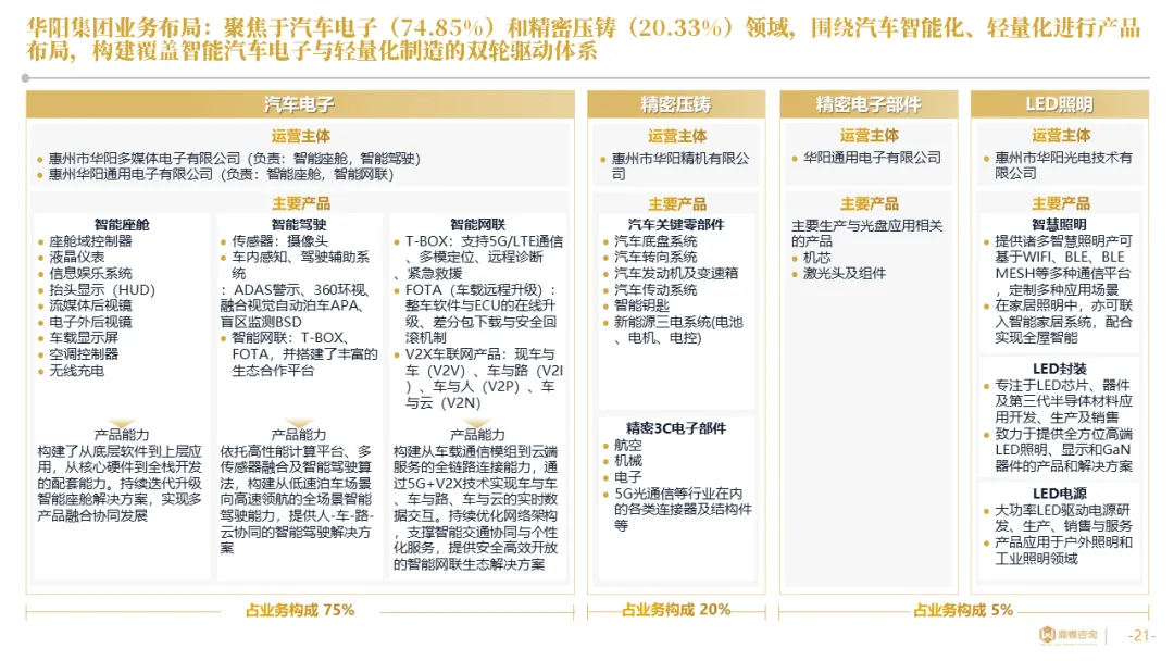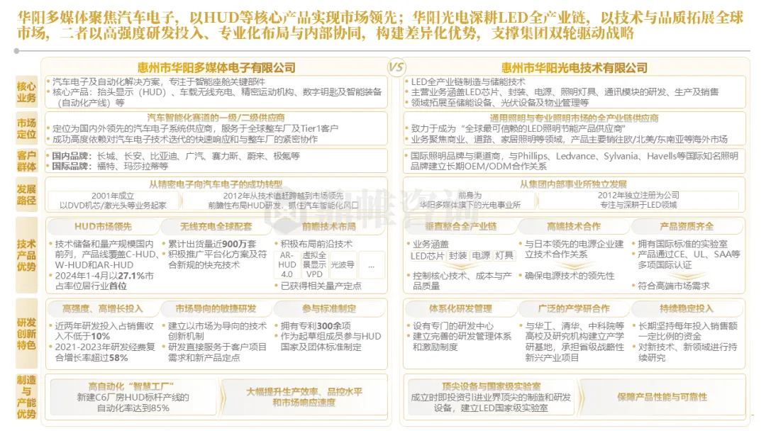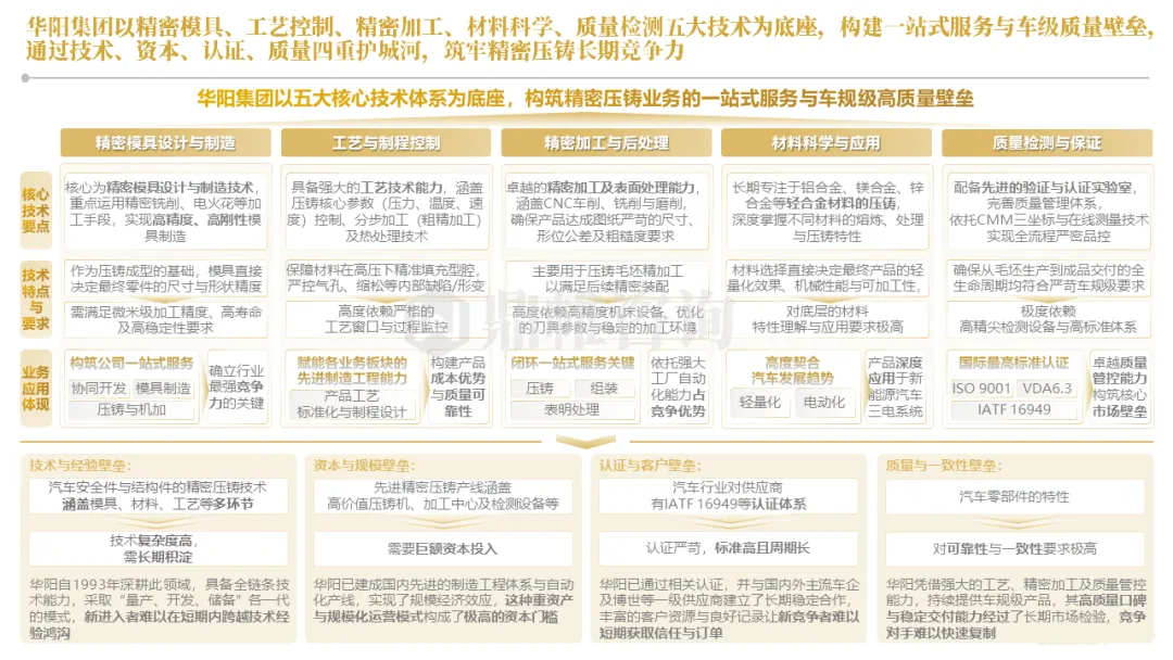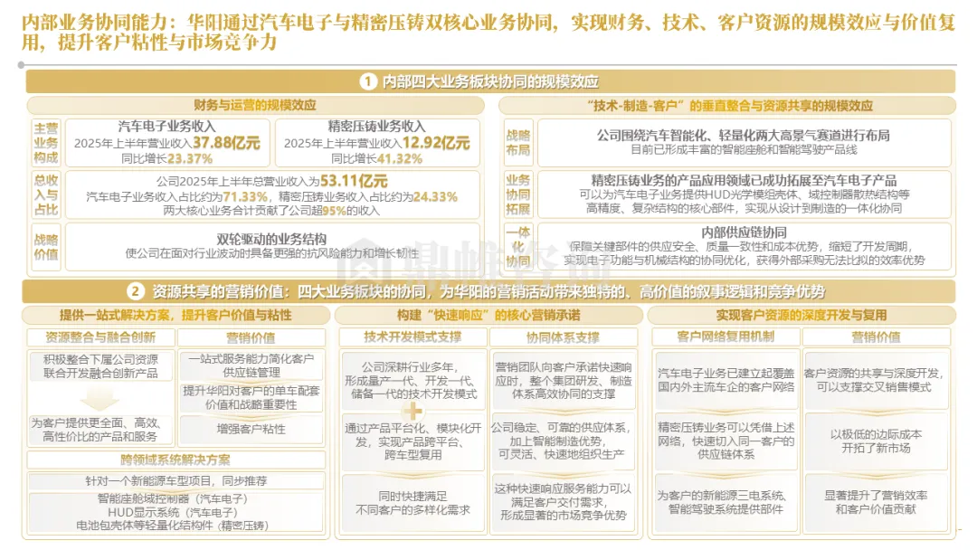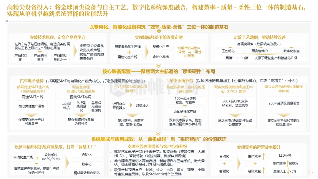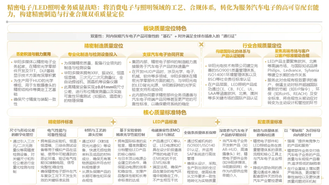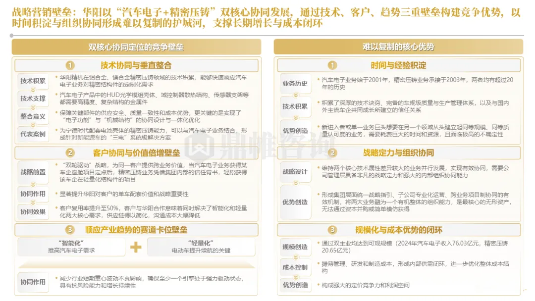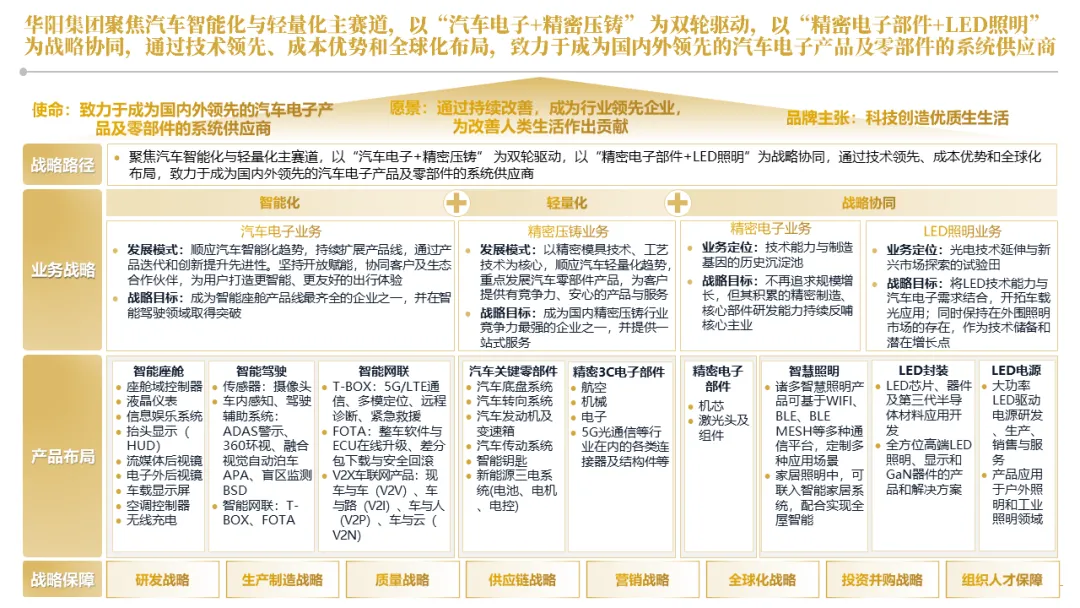 华阳集团以前瞻性战略眼光,锚定汽车“智能化”与“轻量化”两大产业趋势,确立了“汽车电子+精密压铸”双轮驱动的核心业务格局。同时,系统性地将消费电子时代积淀的“光-机-电”一体化精密制造与大规模精益生产基因,成功迁移并升级至汽车产业,构筑了独特的技术与成本根基