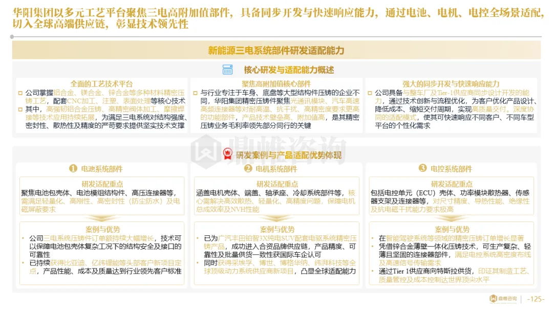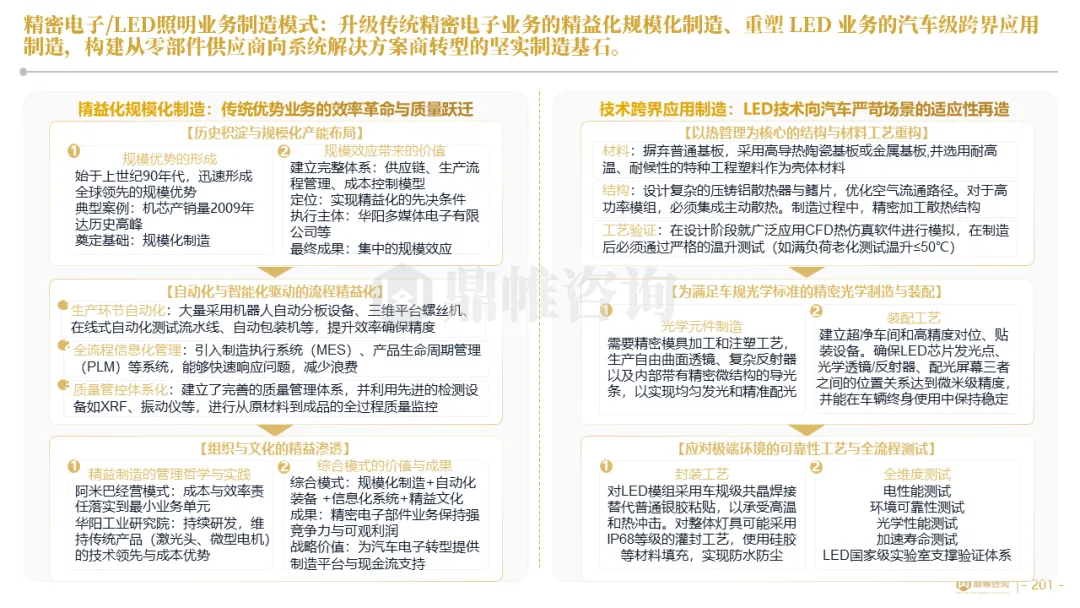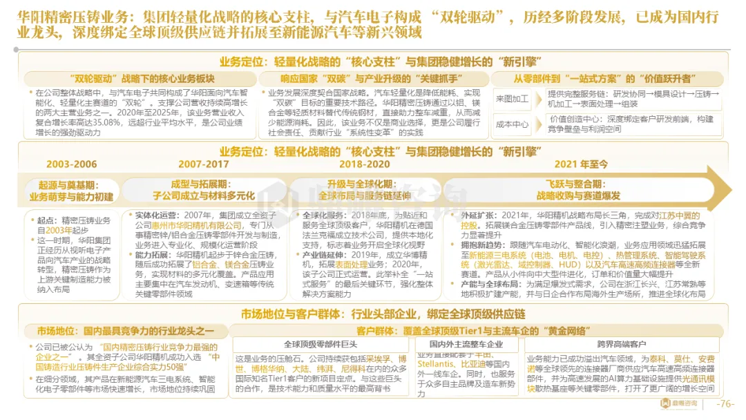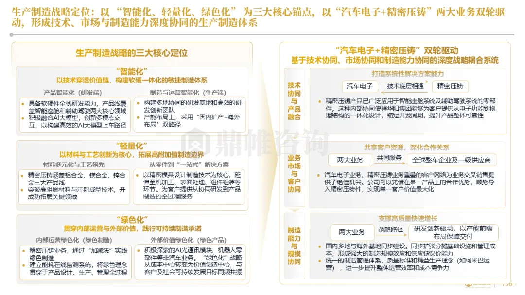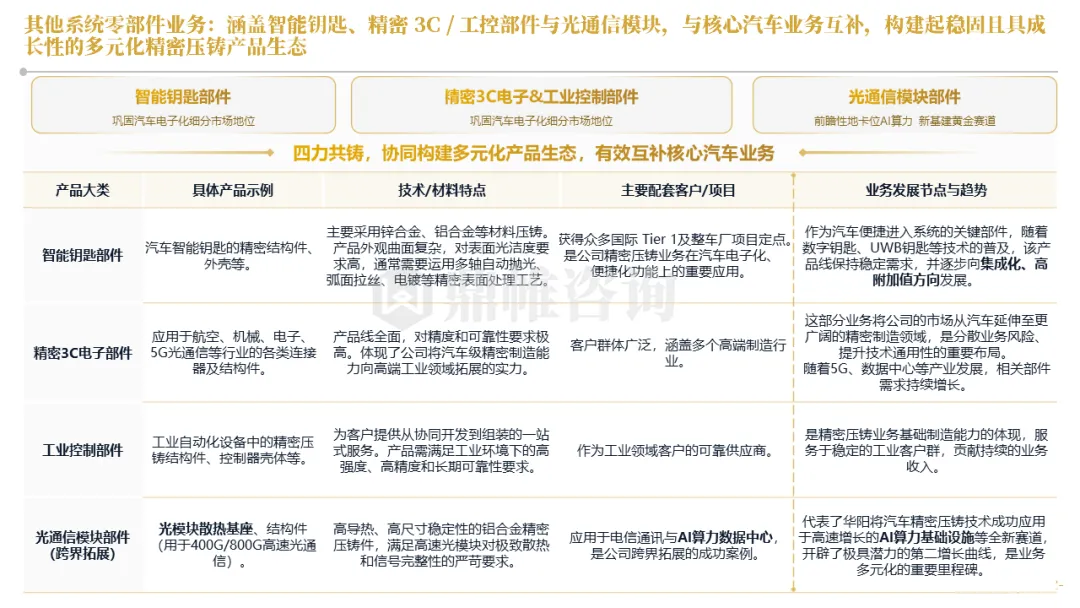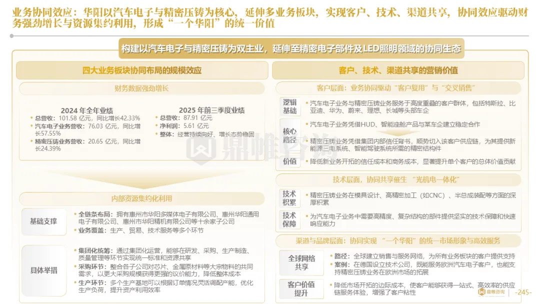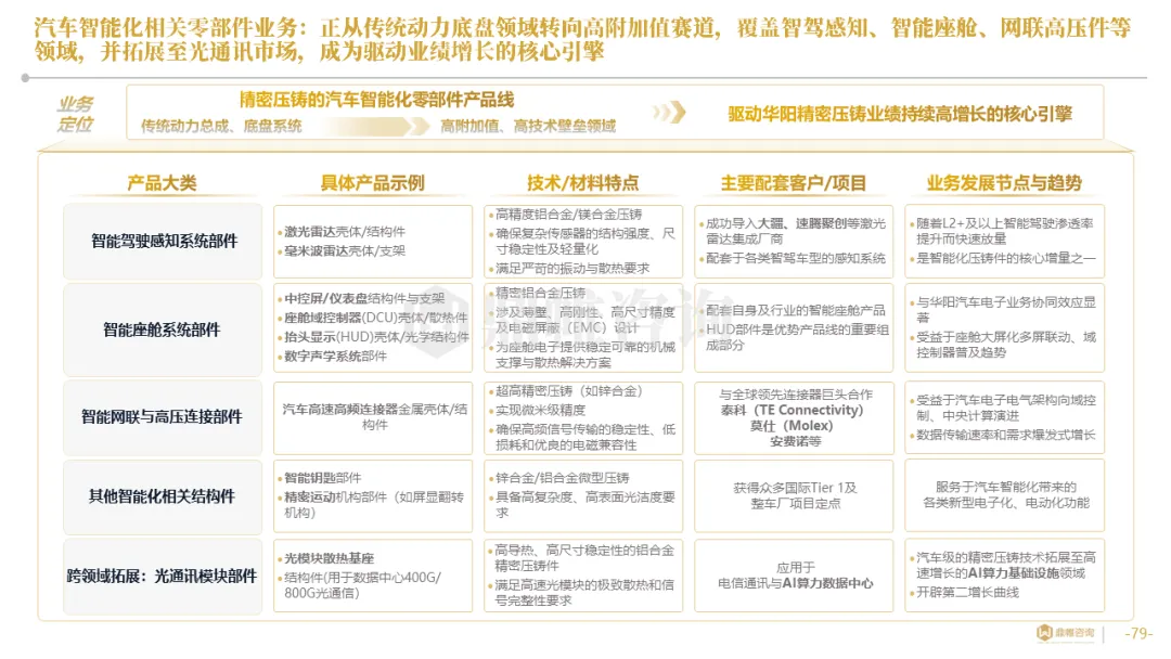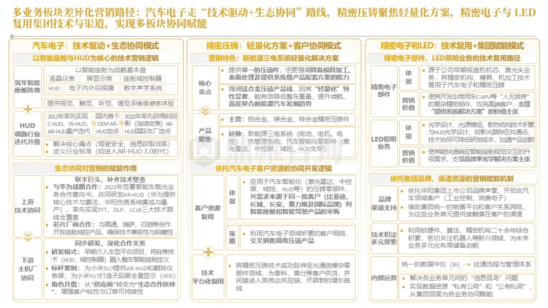 华阳集团以前瞻性战略眼光,锚定汽车“智能化”与“轻量化”两大产业趋势,确立了“汽车电子+精密压铸”双轮驱动的核心业务格局。同时,系统性地将消费电子时代积淀的“光-机-电”一体化精密制造与大规模精益生产基因,成功迁移并升级至汽车产业,构筑了独特的技术与成本根基