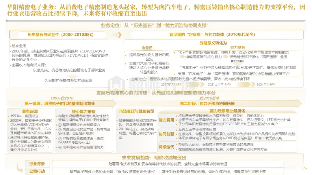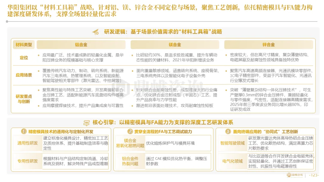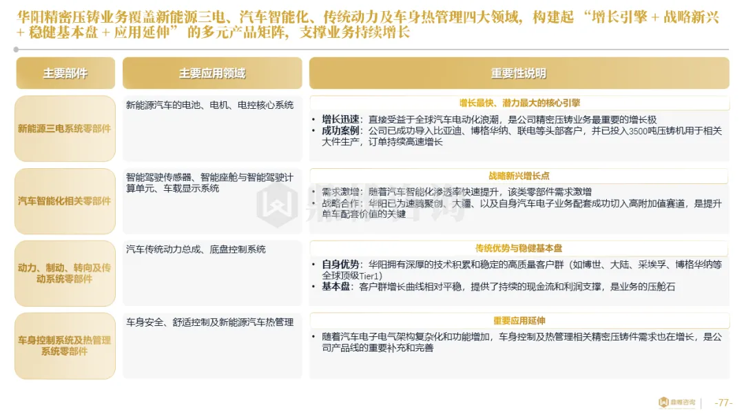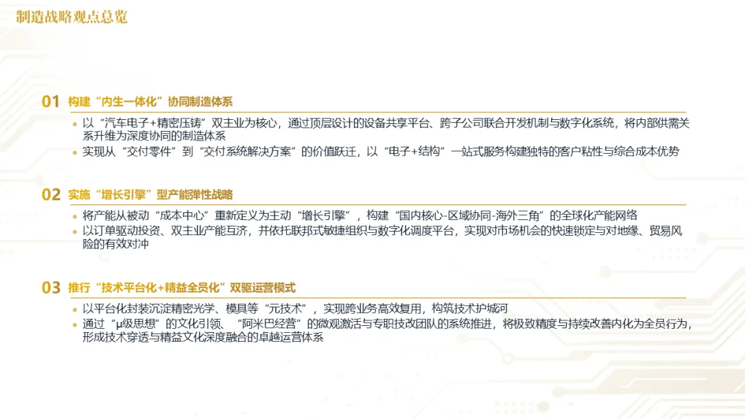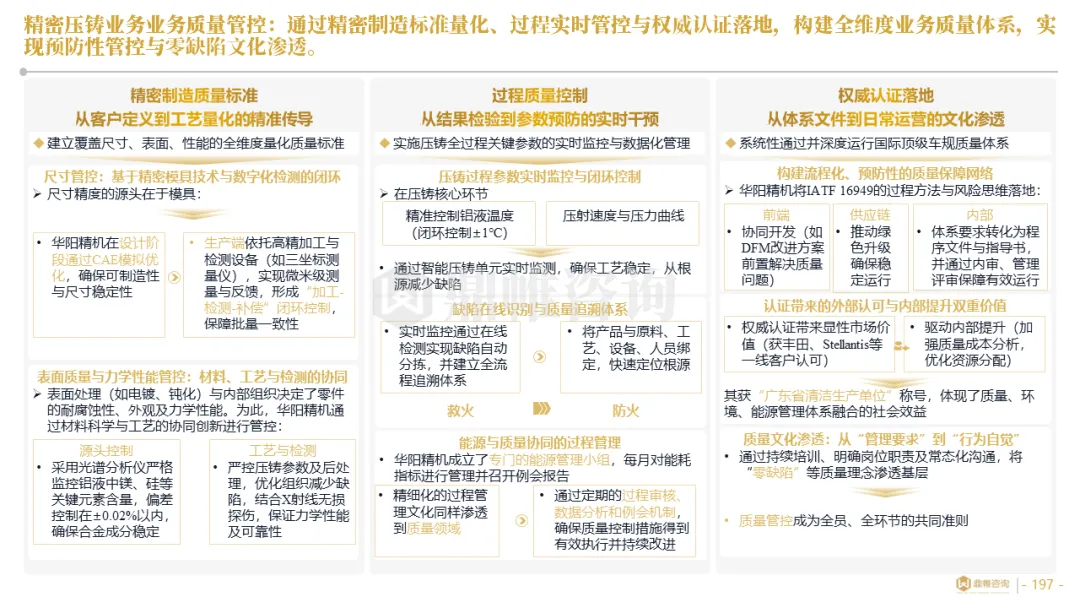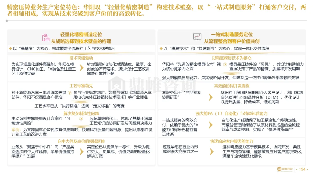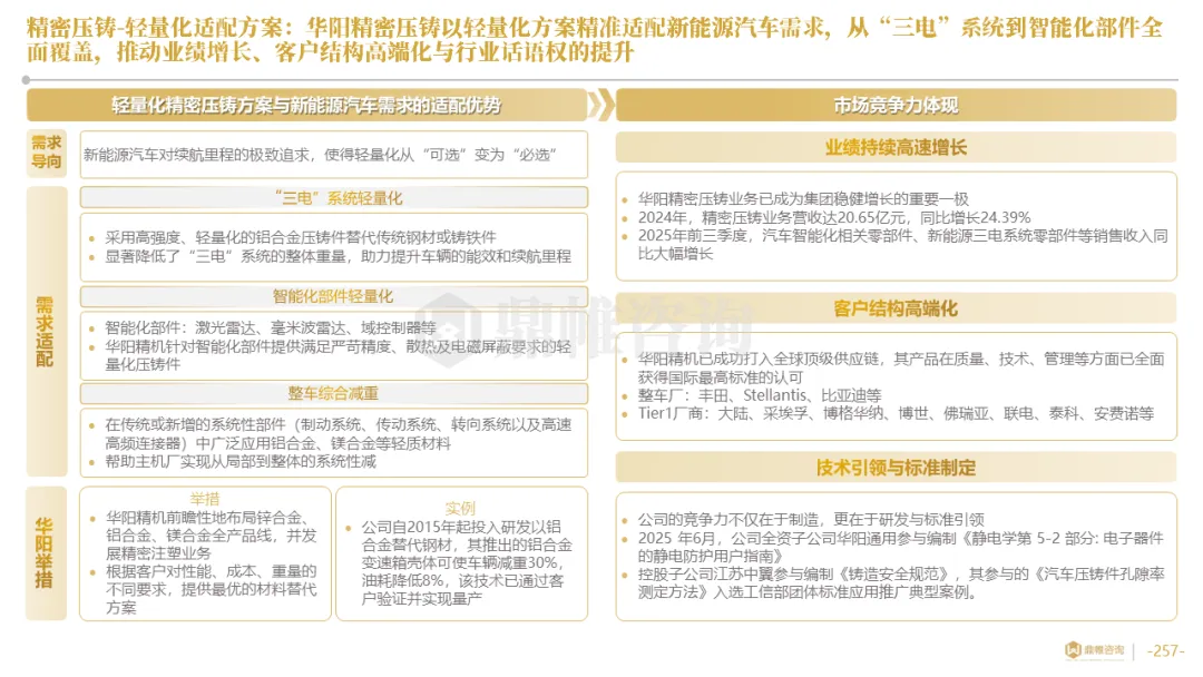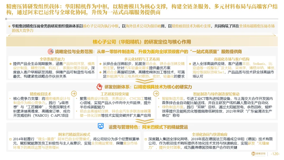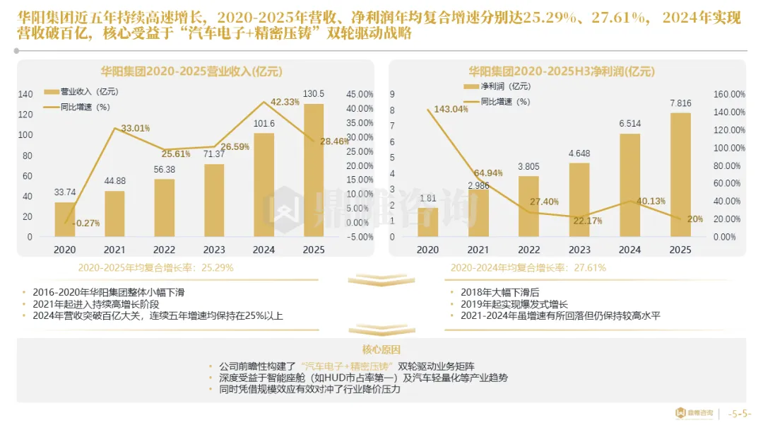 华阳集团以前瞻性战略眼光,锚定汽车“智能化”与“轻量化”两大产业趋势,确立了“汽车电子+精密压铸”双轮驱动的核心业务格局。同时,系统性地将消费电子时代积淀的“光-机-电”一体化精密制造与大规模精益生产基因,成功迁移并升级至汽车产业,构筑了独特的技术与成本根基