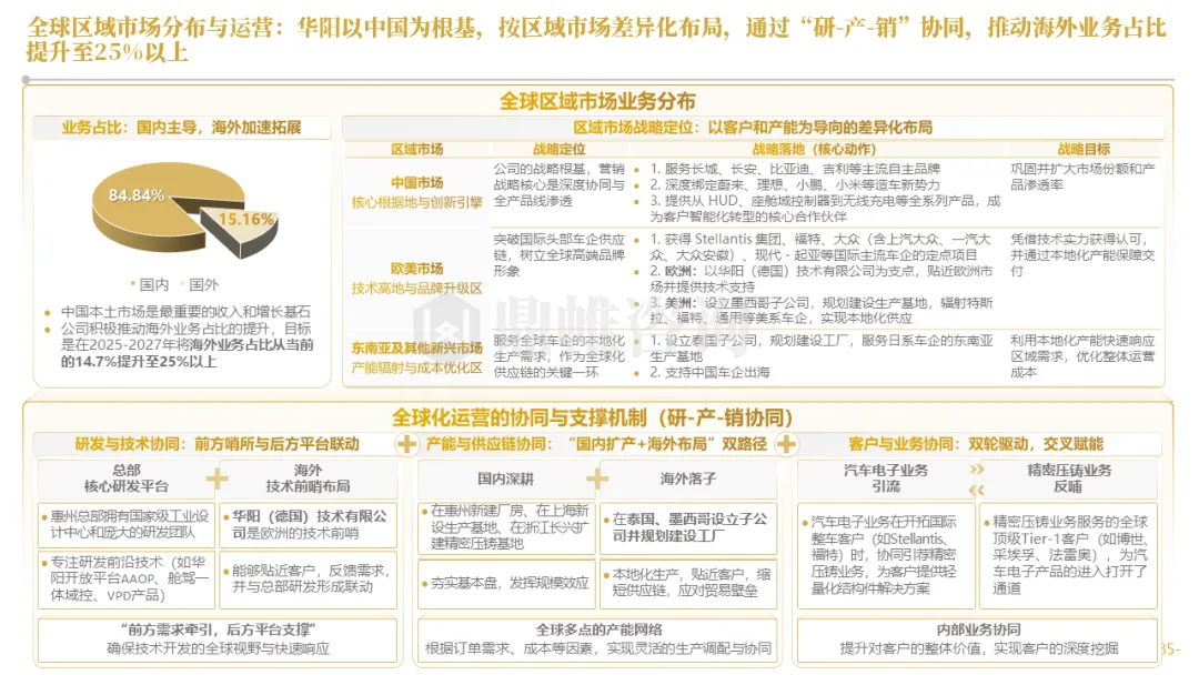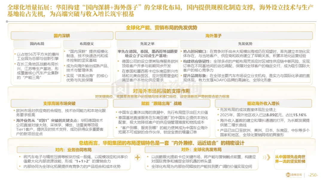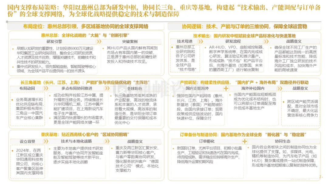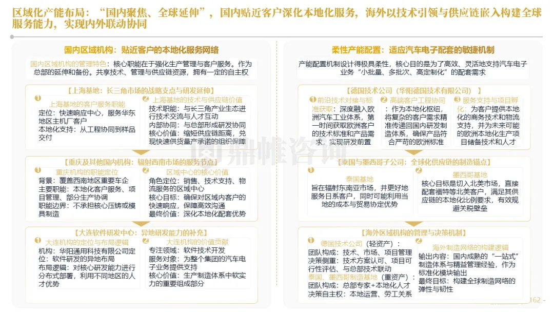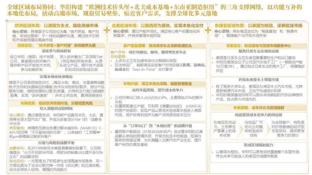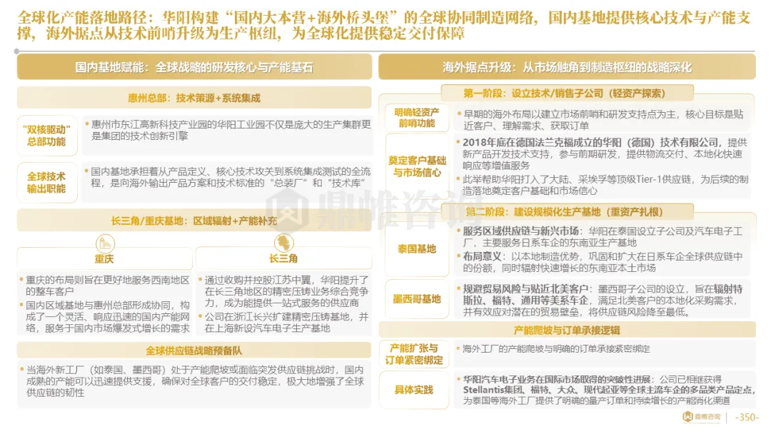 华阳集团构建了以惠州总部为研发中枢,以上海、重庆等国内基地为前沿,以德国技术公司为桥头堡的全球研发布局,并利用时差实现“24小时接力研发”。在德国设立了兼具技术前哨与本地化服务功能的技术公司,在泰国、墨西哥等关键市场,则率先启动了以服务区域客户、规避贸易壁垒为主要目标的生产基地建设,正从“产品出口”向“本地化制造与服务”的战略升级迈进