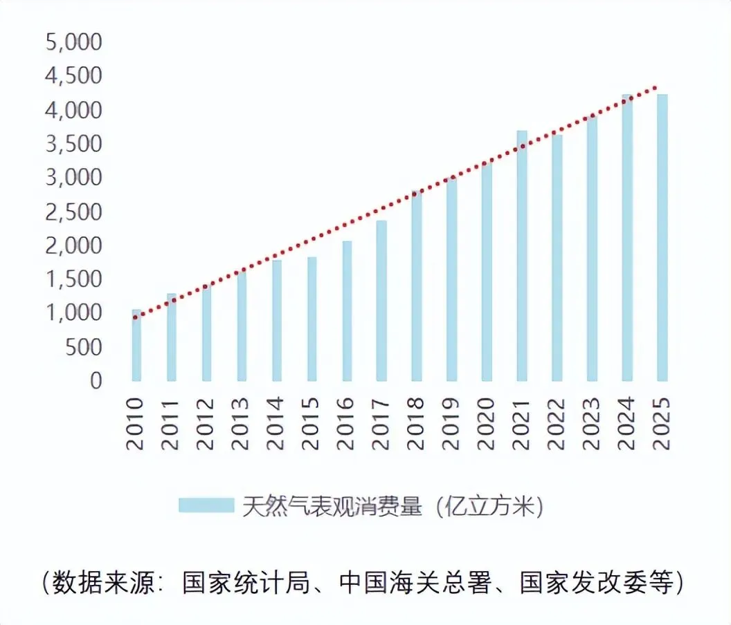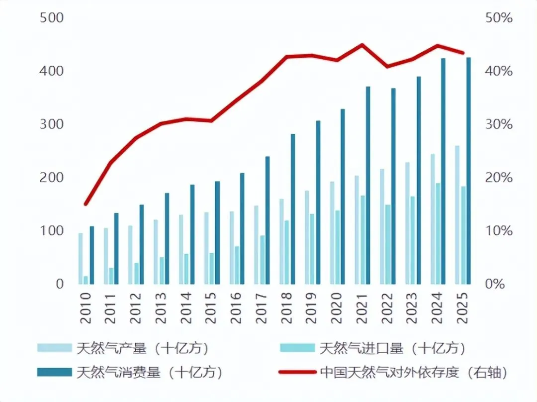 2025 年度,我国天然气产量为 2,619 亿立方米,同比增长 6.2%。但是,受制于我国“富煤、缺油、少气”的能源国情,国产天然气规模长期不能满足消费需求增长,天然气对外依存度从 2010 年的 10%快速上升至 2025 年的 43.47%。
