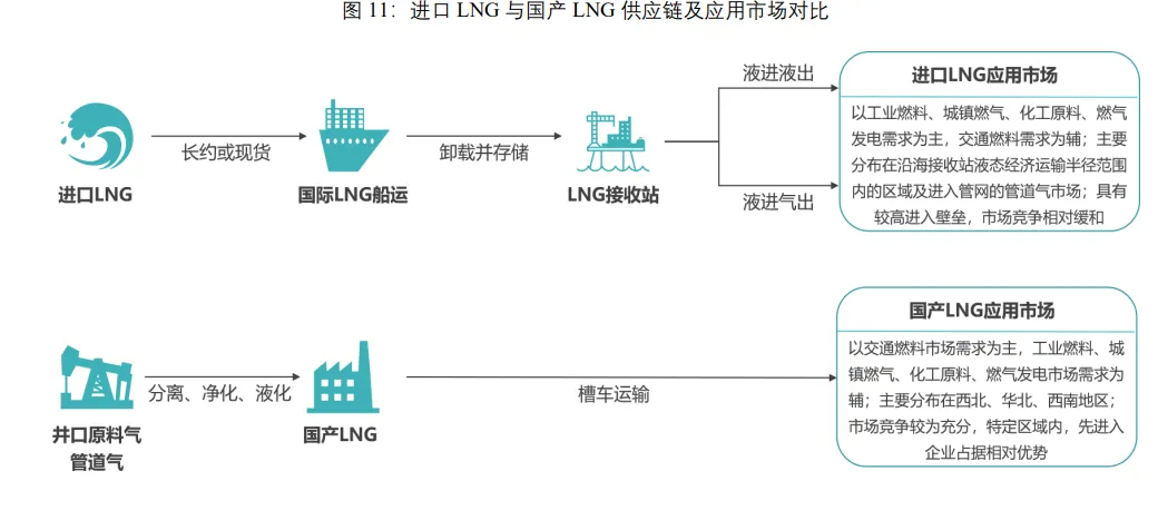 下游主要涉及天然气的应用,包括交通燃料、燃气发电、工业燃料、城镇燃气、化工原料等,参与主体主要包括 LNG 汽车加气站、城市燃气公司、燃气运营商等,市场竞争较为充分。