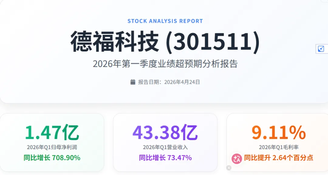 德福科技 2026 年第一季度的业绩表现确实大大超出了市场预期,归母净利润 1.47 亿元,比预告上限高出 13% 以上,充分展现了公司强大的经营能力和成长潜力。