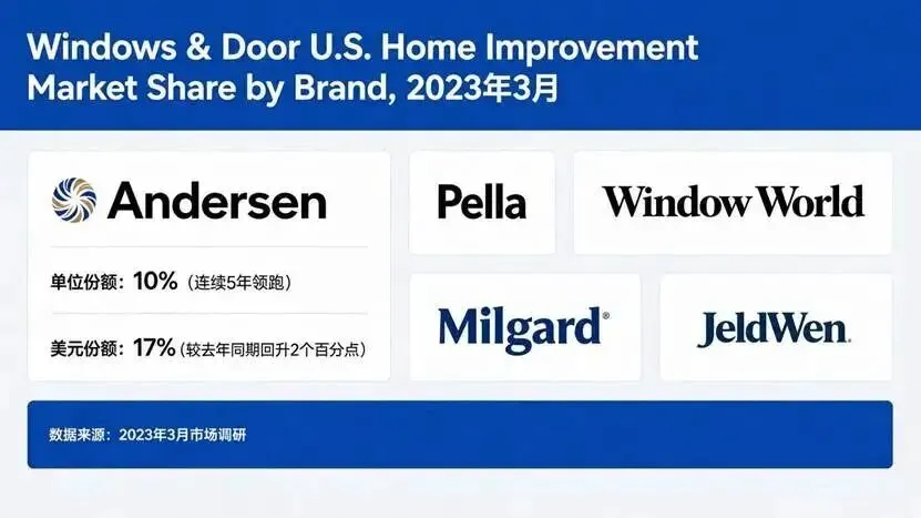 截至2023年3月,门窗行业领先品牌是 Andersen,单位份额为10%,并且已经连续5年领先其他所有品牌。