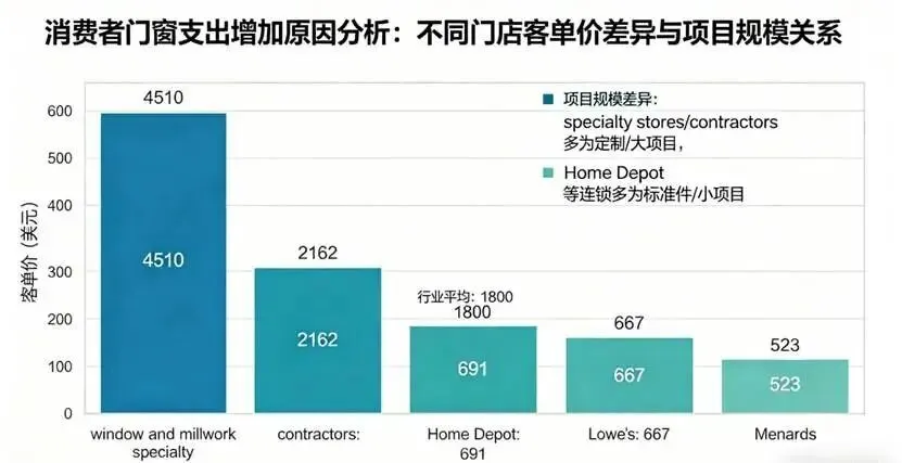 行业成本上升,主要是由于门窗/木作专业门店的平均价格显著上涨。这也推动了专业门店美元份额的大幅增加,并帮助其赢得市场领先地位。