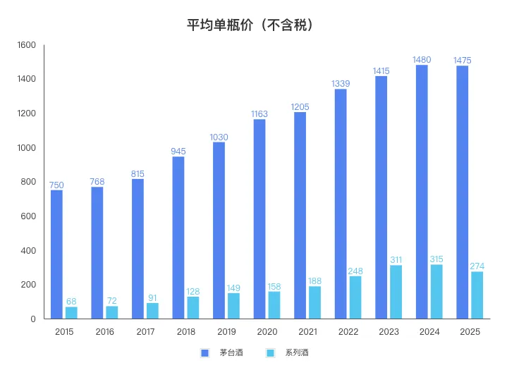 再看下全年业务,茅台酒方面,25年收入1465亿元,微增0.4%,毛利率93.5%基本保持稳定,其中销量/吨价+0.7%/-0.3%。茅台的单瓶均价也是近10年首次下降,从1480微降至1475,主要是由于非标茅台的下降。