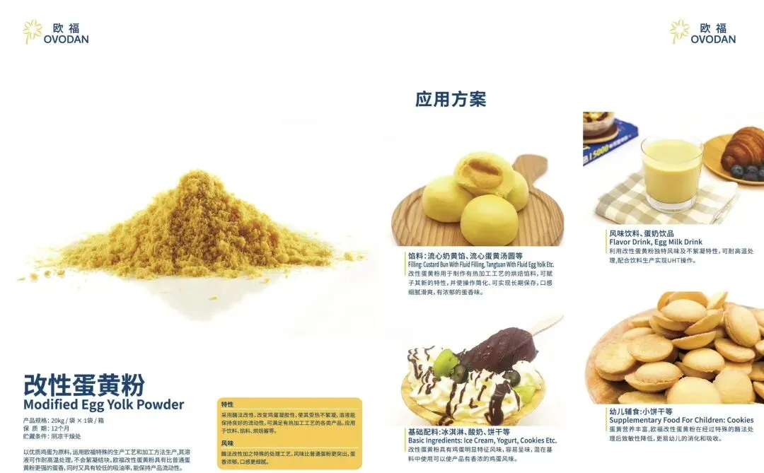 具体采用酶法改性,改变鸡蛋凝胶性,不会絮凝结块。欧福改性蛋黄粉具有比普通蛋黄粉更强的蛋香,同时又具有较低的吸油率,能保持产品流动性。