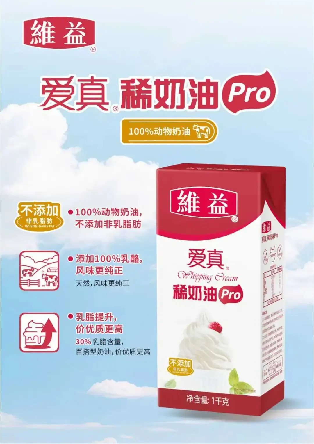严格遵循新国标GB19646-2025,采用更高品质纯乳脂原料,100%动物奶油,不添加非乳脂肪,100%乳酪加持,风味纯正,乳脂含量为30%,价优质更高。爱真稀奶油Pro,以卓越的风味与稳定性,为产品注入更高标准的品质活力!