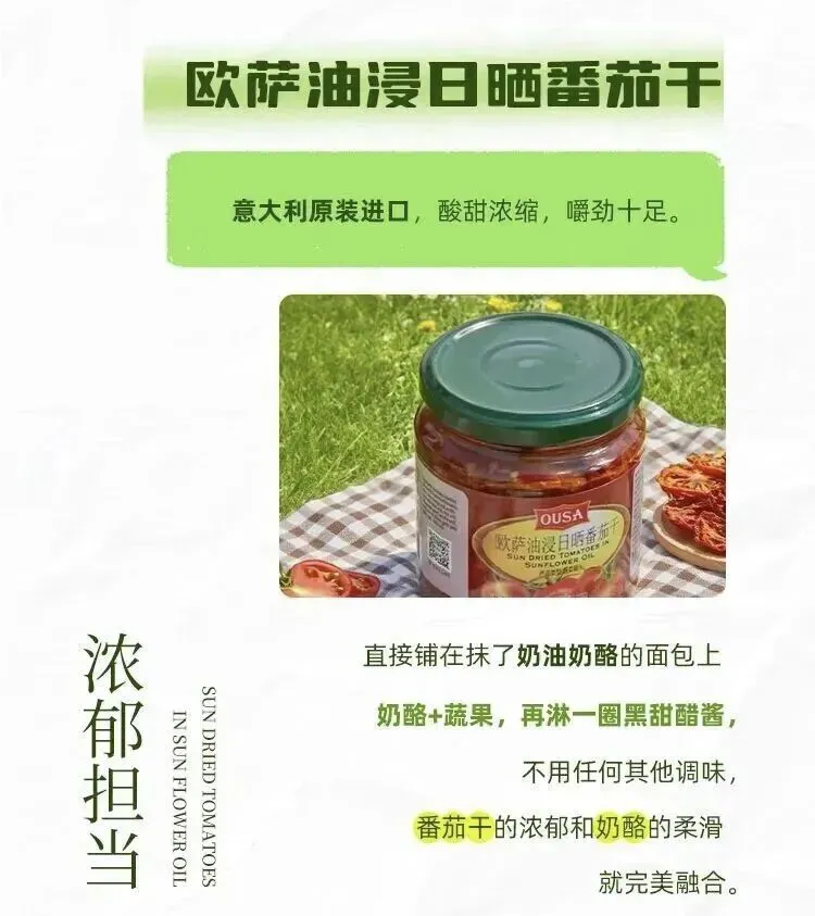 意大利原装进口,酸甜浓缩,嚼劲十足。直接铺在抹了奶油奶酪的面包上奶酪+蔬果,再淋一圈黑甜醋酱,不用任何其他调味,番茄干的浓郁和奶酪的柔滑就完美融合。