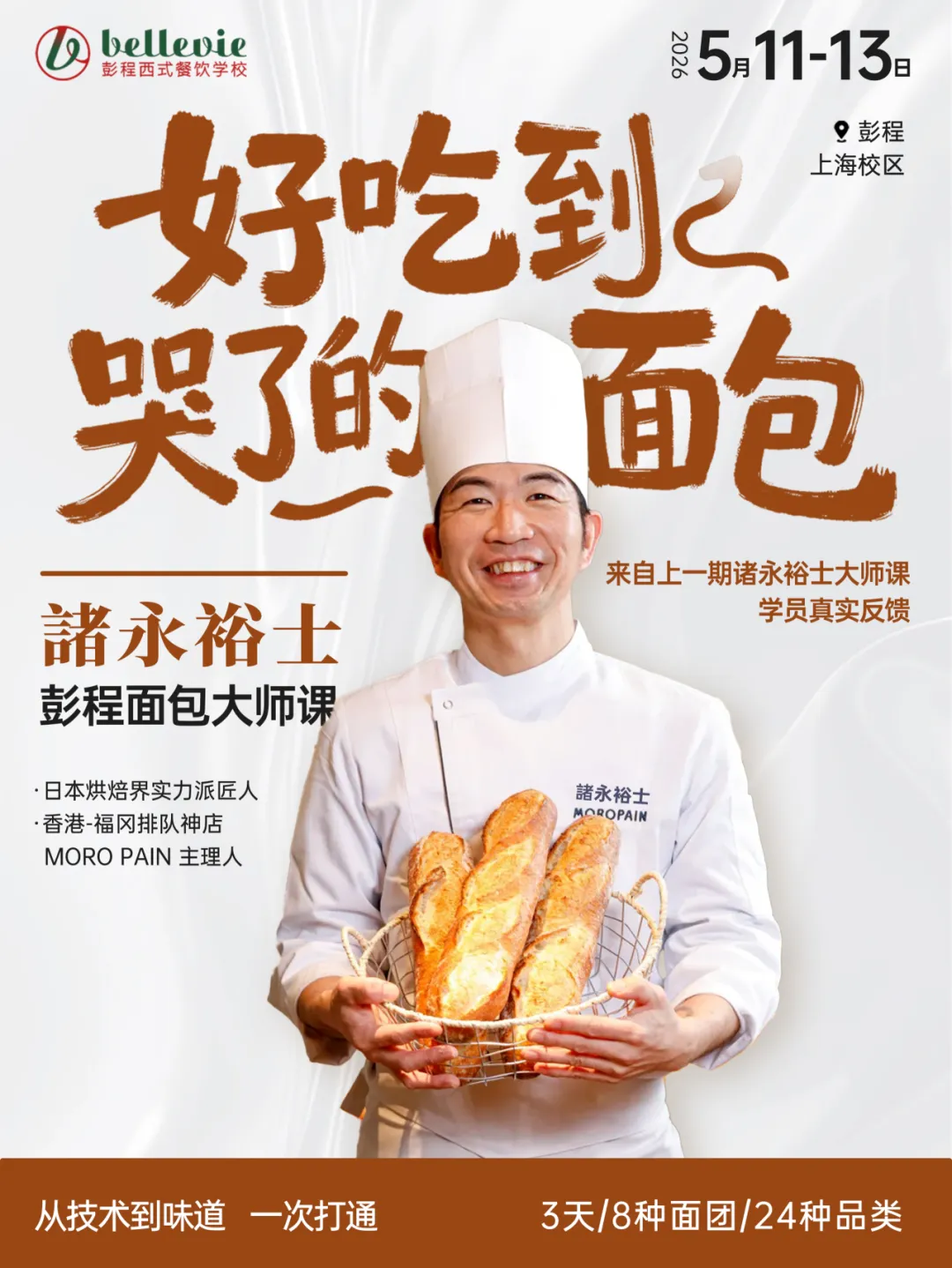 5月11日-13日彭程上海校区「諸永裕士面包大师课」重磅返场,3天沉浸式实战大师课,全程以门店落地产品为核心,从8大面团→延伸24款热销爆品。覆盖法棍、天然酸种、吐司、丹麦起酥、调理面包等多品类深度拆解门店热销爆款,搭配大师独家发酵工艺与标准化后厨管控,把日本名店真正赚钱的配方、产品、工艺,全部手把手教给你!