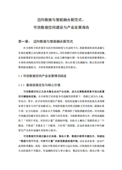 在全球数字经济竞争从技术转向制度与生态的今天,数据要素的高效流通与市场化配置已成为国家竞争力的核心。可信数据空间作为数据流通利用基础设施,是数据要素价值共创的应用生态,也是支撑构建全国一体化数据市场的重要载体。本章将系统阐述可信数据空间的基础定位、核心价值与发展脉络,揭示其如何重塑数据流通范式,为释放数据要素价值奠定信任基石。