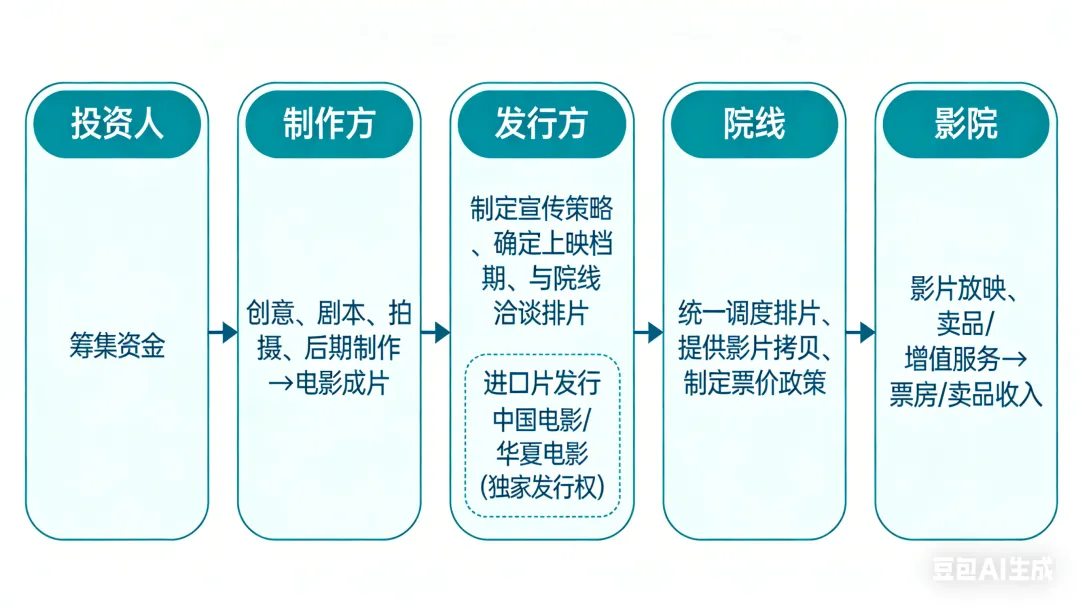 电影产业链是一个环环相扣的价值创造系统,以"投资制作—发行—放映"为主线,并不断向IP衍生、文旅消费等价值溢出领域延伸。理解这条链,是看懂电影投资逻辑的基础。