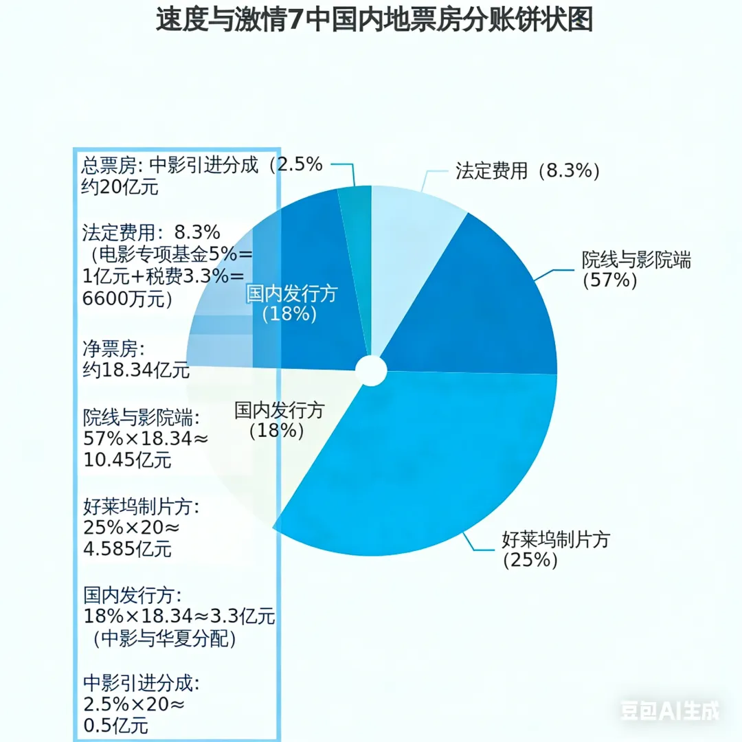 以2015年上映的好莱坞电影 《速度与激情7》 为例,它在中国内地最终收获了约20亿元总票房。我们先扣除法定费用的 8.3%——5%的电影专项基金(1亿元)+ 3.3%的税费(6600万元),剩下 18.34亿元净票房。院线与影院端从净票房中分得 57%(约10.45亿元)。