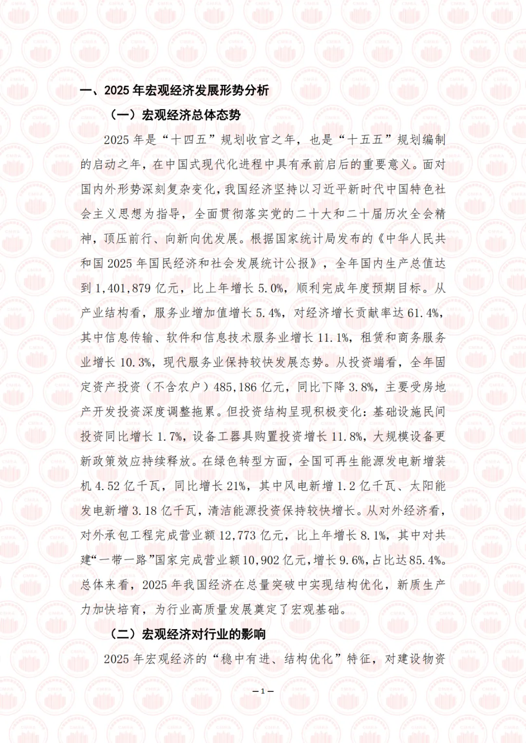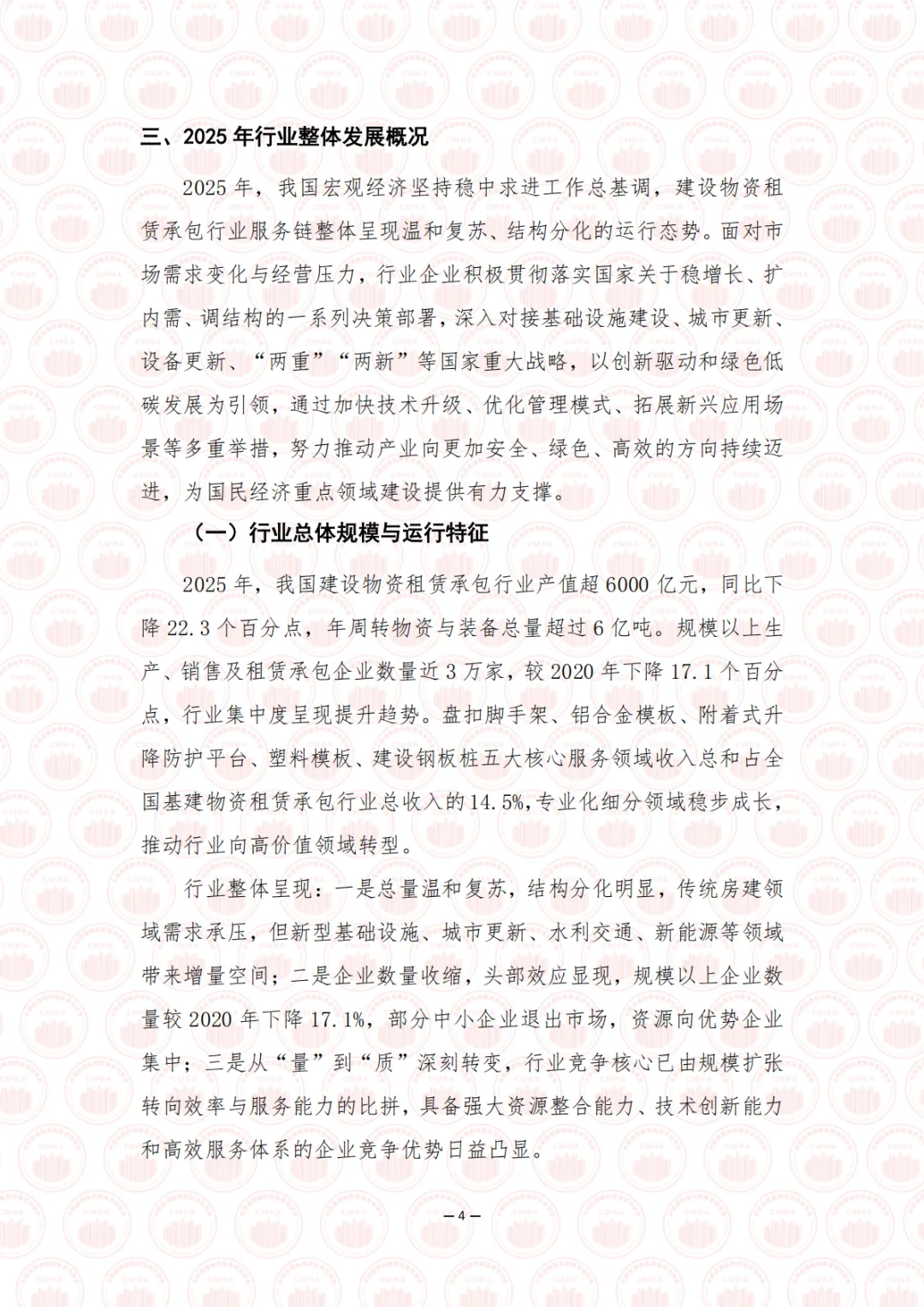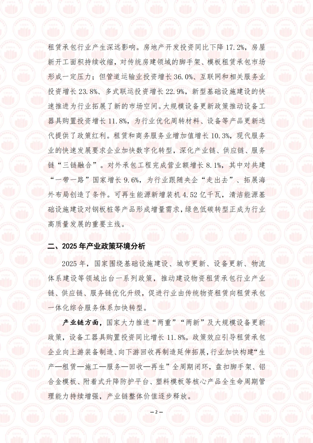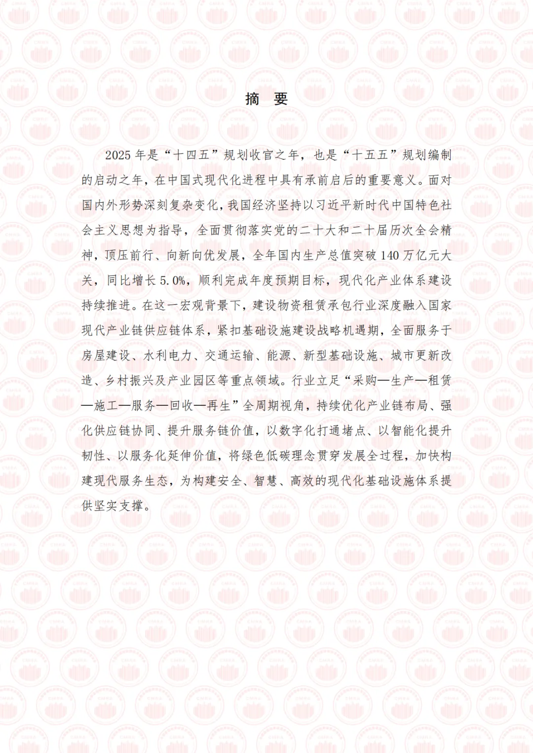 2025 年是“十四五”规划收官之年,也是“十五五”规划编制的启动之年,在中国式现代化进程中具有承前启后的重要意义。面对国内外形势深刻复杂变化,我国经济坚持以习近平新时代中国特色社会主义思想为指导,全面贯彻落实党的二十大和二十届历次全会精神,顶压前行、向新向优发展,全年国内生产总值突破 140 万亿元大关,同比增长 5.0%,顺利完成年度预期目标,现代化产业体系建设持续推进。在这一宏观背景下,建设物资租赁承包行业深度融入国家现代产业链供应链体系,紧扣基础设施建设战略机遇期,全面服务于房屋建设、水利电力、交通运输、能源、新型基础设施、城市更新改造、乡村振兴及产业园区等重点领域。行业立足“采购—生产—租赁—施工—服务—回收—再生”全周期视角,持续优化产业链布局、强化供应链协同、提升服务链价值,以数字化打通堵点、以智能化提升韧性、以服务化延伸价值,将绿色低碳理念贯穿发展全过程,加快构建现代服务生态,为构建安全、智慧、高效的现代化基础设施体系提供坚实支撑。