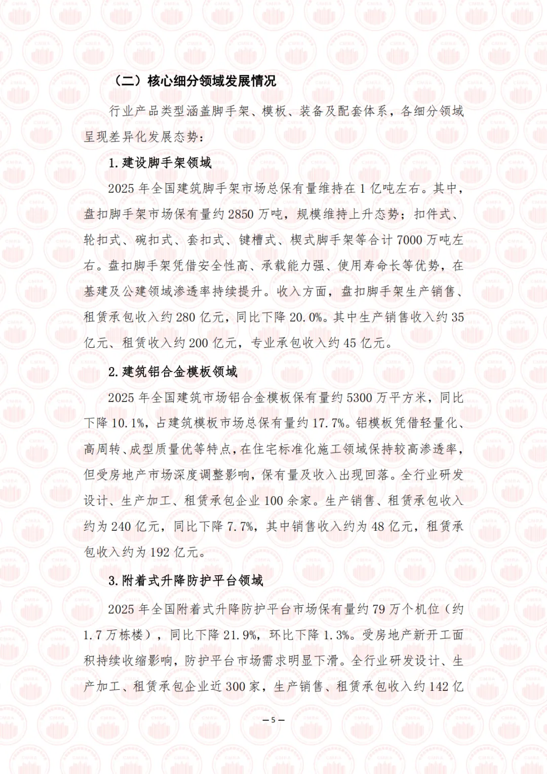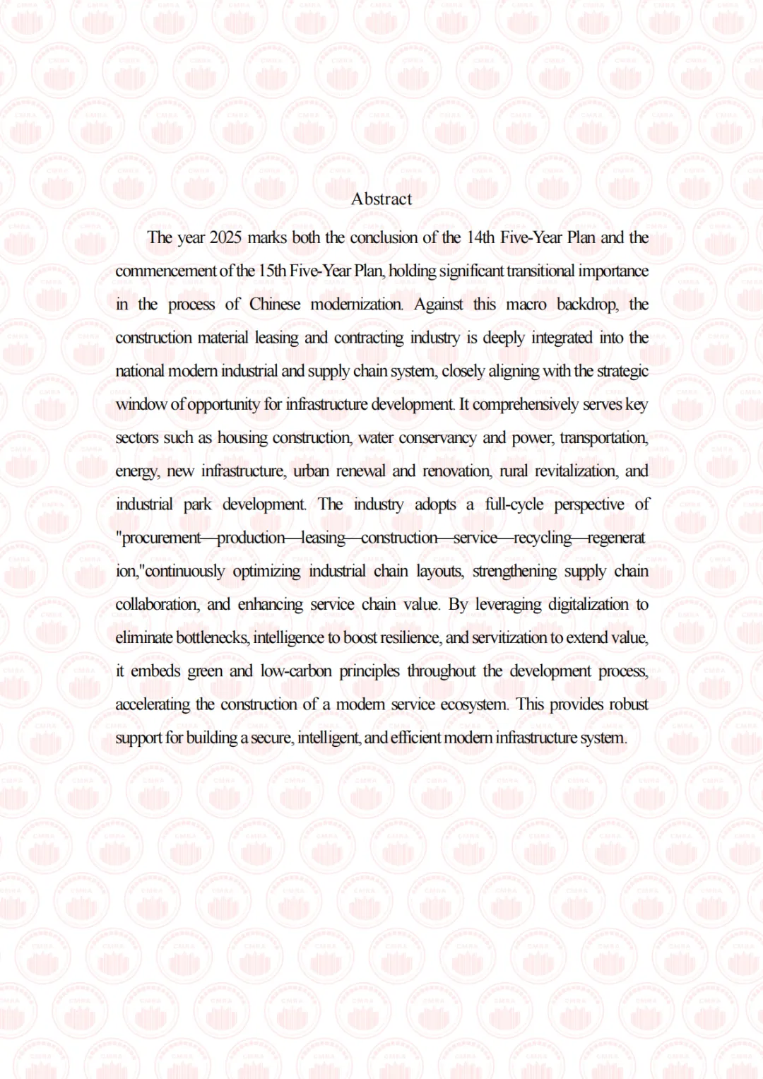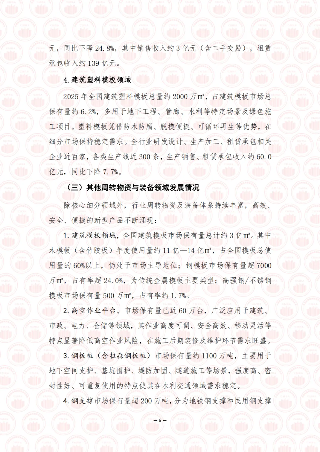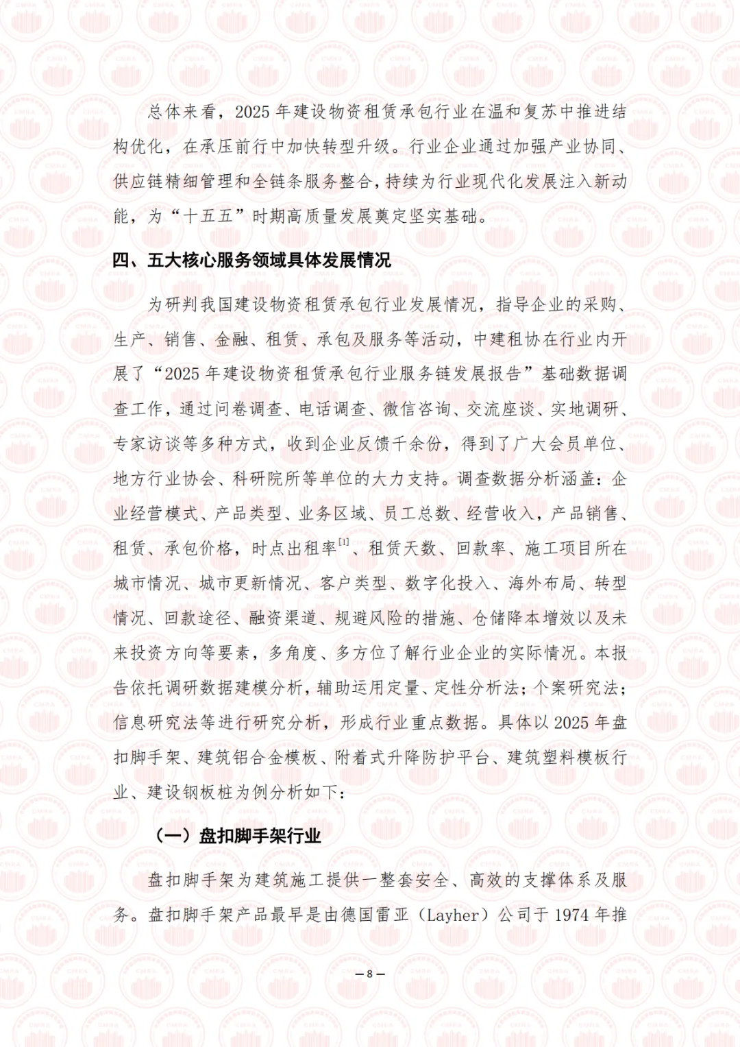 2025 年是“十四五”规划收官之年,也是“十五五”规划编制的启动之年,在中国式现代化进程中具有承前启后的重要意义。面对国内外形势深刻复杂变化,我国经济坚持以习近平新时代中国特色社会主义思想为指导,全面贯彻落实党的二十大和二十届历次全会精神,顶压前行、向新向优发展,全年国内生产总值突破 140 万亿元大关,同比增长 5.0%,顺利完成年度预期目标,现代化产业体系建设持续推进。在这一宏观背景下,建设物资租赁承包行业深度融入国家现代产业链供应链体系,紧扣基础设施建设战略机遇期,全面服务于房屋建设、水利电力、交通运输、能源、新型基础设施、城市更新改造、乡村振兴及产业园区等重点领域。行业立足“采购—生产—租赁—施工—服务—回收—再生”全周期视角,持续优化产业链布局、强化供应链协同、提升服务链价值,以数字化打通堵点、以智能化提升韧性、以服务化延伸价值,将绿色低碳理念贯穿发展全过程,加快构建现代服务生态,为构建安全、智慧、高效的现代化基础设施体系提供坚实支撑。