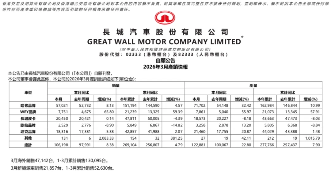 销量层面,数据显示,2026年一季度长城汽车累计销量为269104辆,同比增长4.79%。其中,新能源车销量为52630辆,海外销量为130095辆。细分品牌中,哈弗品牌依然是长城汽车的销量担当,一季度累计销量为151194辆,同比增长4.57%,占长城汽车总销量的56.18%;魏牌累计销量为21239辆,同比增长59.39%;坦克品牌计销量为42857辆,同比增长2.07%;而欧拉品牌累计销量为5849辆,同比下滑14.82%;长城皮卡累计销量为47811辆,同比下滑4.39%。