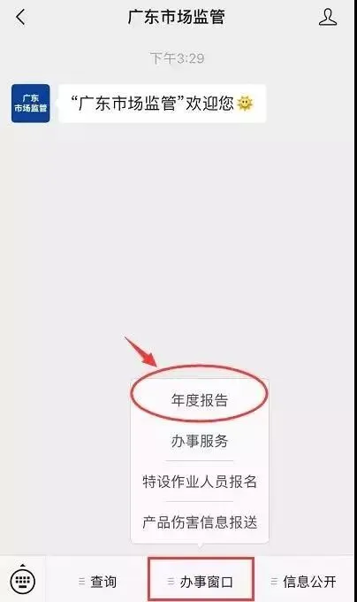 此外,也可以通过微信填报,进入“广东市场监管”微信公众号在“办事窗口”菜单栏找到“年度报告”